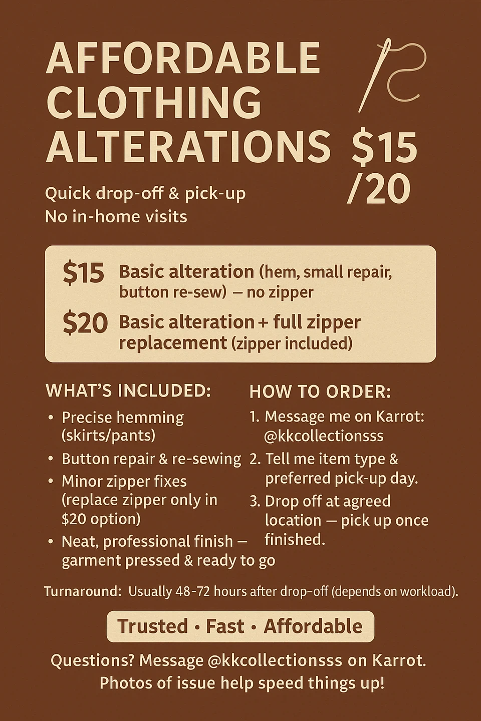 65Offering affordable clothing alterations with quick drop-off and pick-up! No in-home visits. Basic alterations (hem, small repair, button re-sew) are $15 (no zipper). Basic alteration + full zipper replacement (zipper included) is $20. What's included: - Precise hemming (skirts/pants) - Button repair & re-sewing - Minor zipper fixes (replace zipper only in $20 option) - Neat, professional finish - garment pressed & ready to go Turnaround is usually 48-72 hours after drop-off (depends on workload). Message @kkcollectionsss on Karrot with any questions and photos of the issue to help speed things up!