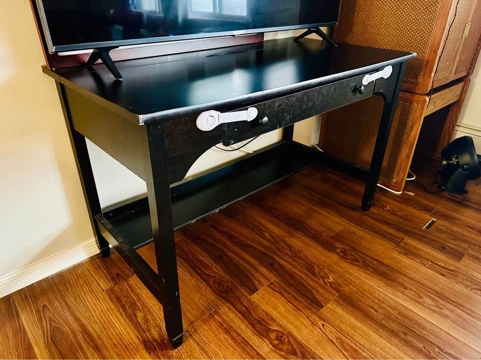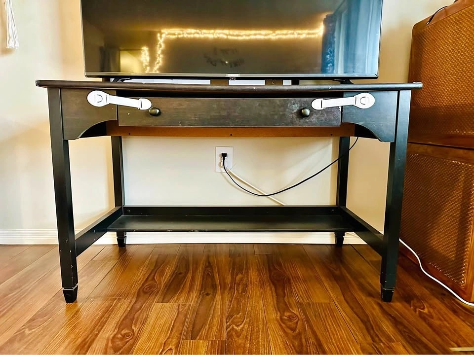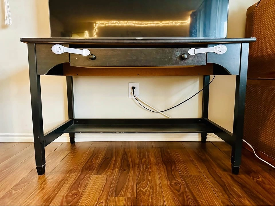 TV Table with drawer and hidden compartment at the back. Can accommodate up to 55” TV. The drawer needs to be tightened as shown in the picture and this reflects in the pricing. Only cash accepted.