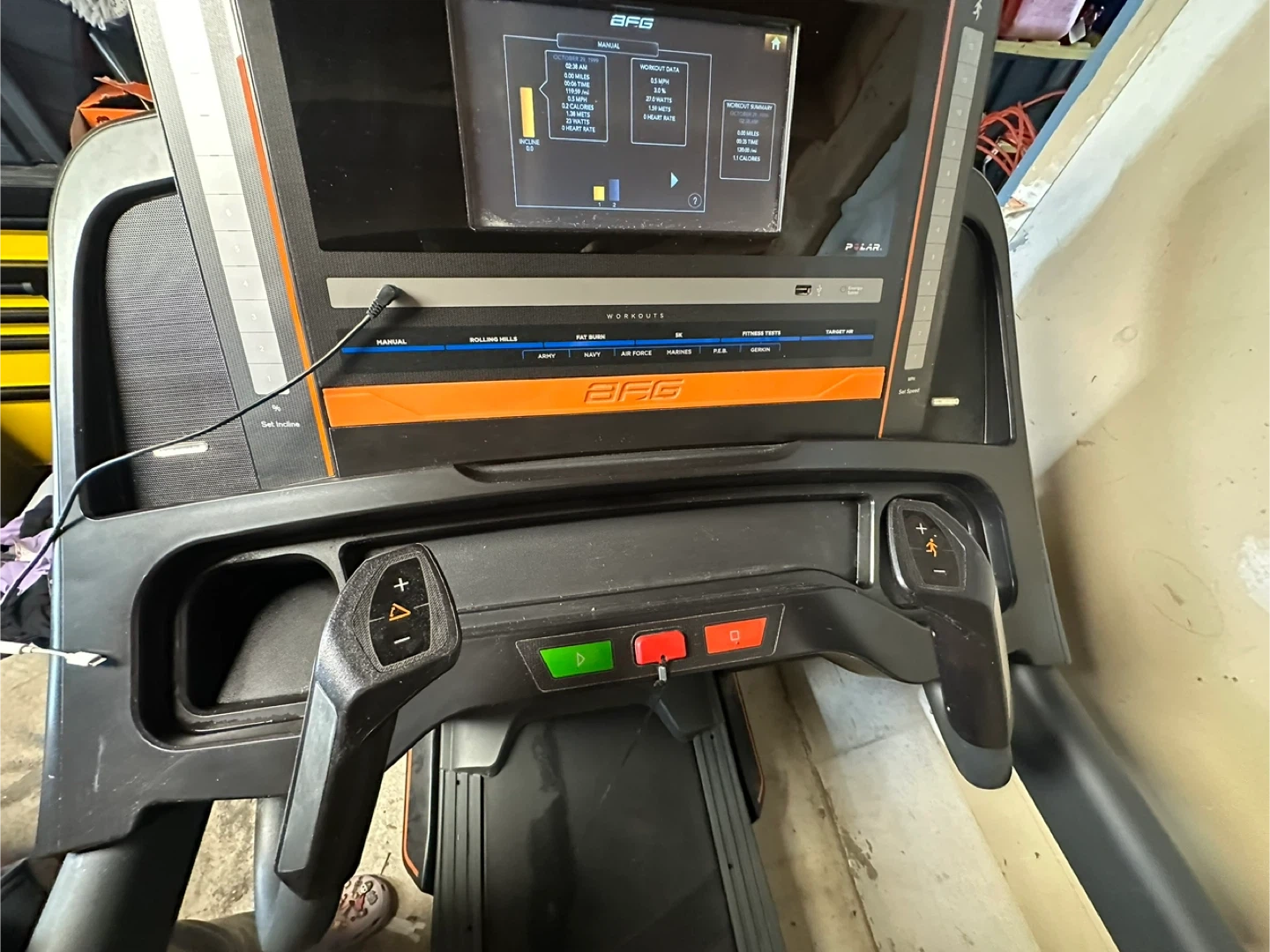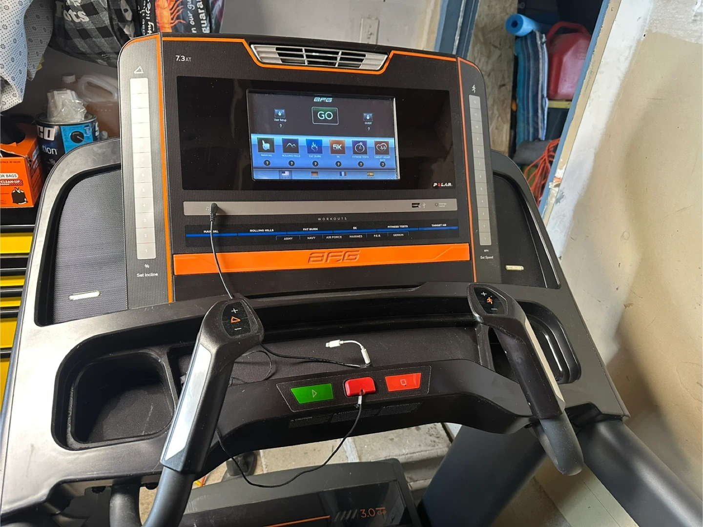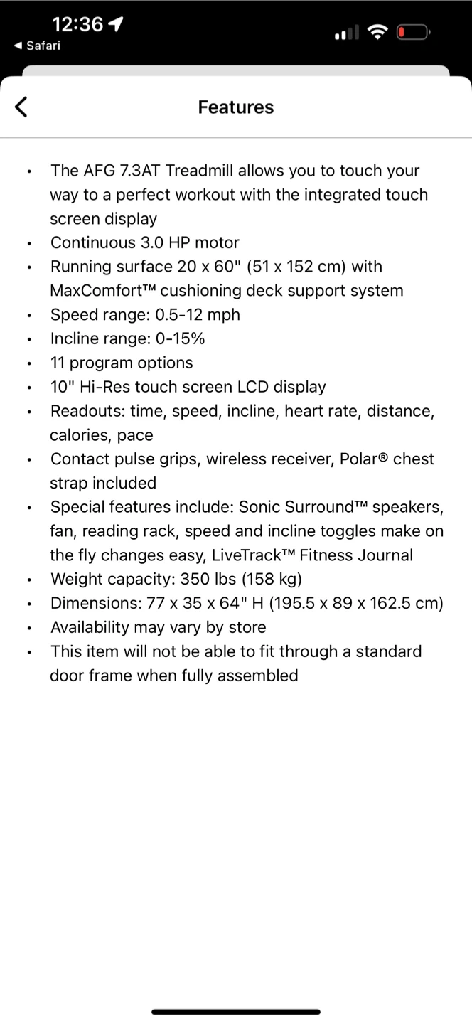 10Selling an AFG 7.3AT treadmill! It has a touchscreen display and a running surface of 20 x 60 inches (51 x 152 cm). It also features a MaxComfort cushioning deck support system and a speed range of 0.5-12 mph. Other features include: - 11 program options - 10" Hi-Res touch screen LCD display - Contact pulse grips, wireless receiver, Polar chest strap included - Sonic Surround speakers, fan, reading rack, and speed and incline toggles Will need a truck for pickup!
