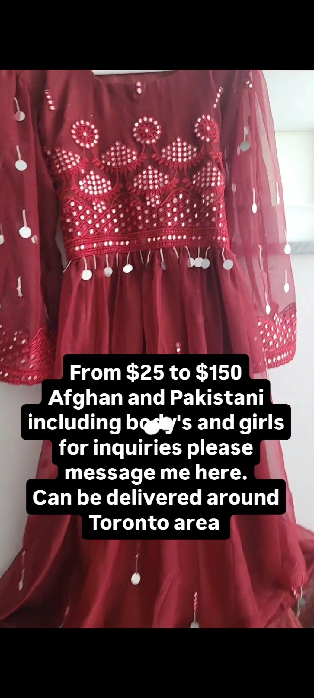 75Selling a collection of Afghan and Pakistani dresses. Available in various colours and designs. Prices range from $25 to $180. Delivery available around Toronto area