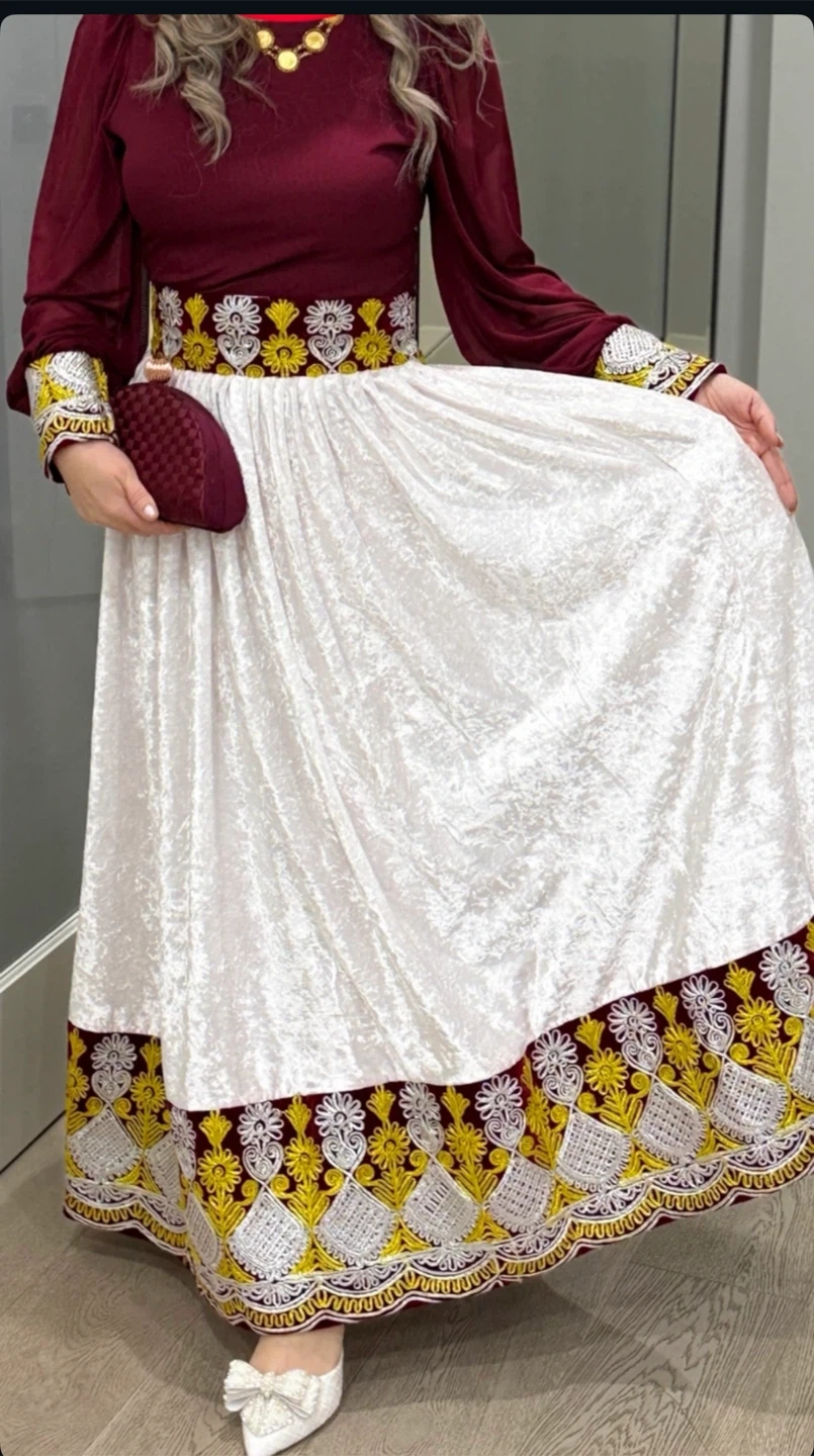 Beautiful Afghan traditional dress. The top is a rich burgundy colour with intricate embroidery around the waist and cuffs. The skirt is a flowing white velvet with matching embroidery at the hem. A lovely piece for special occasions!