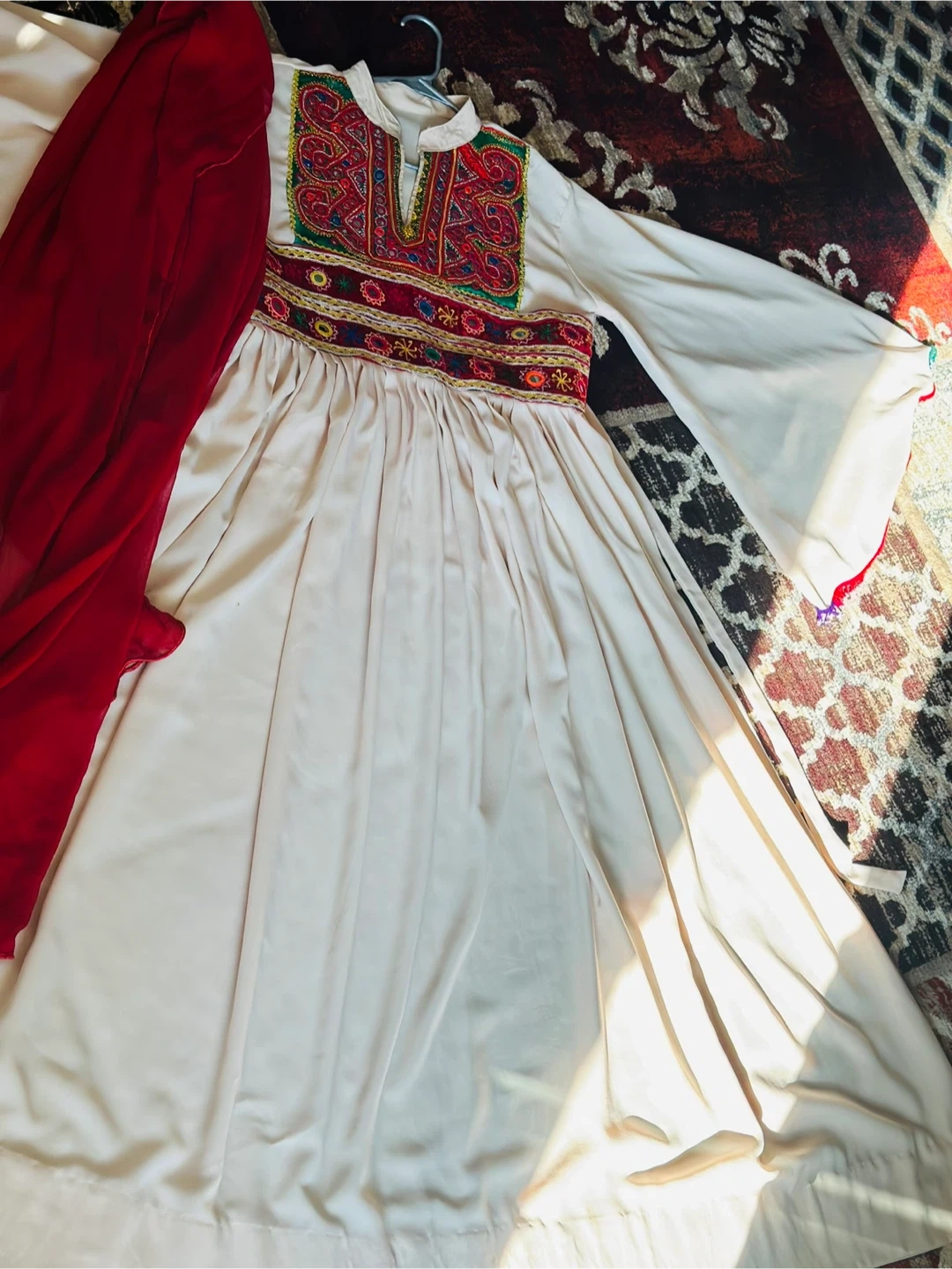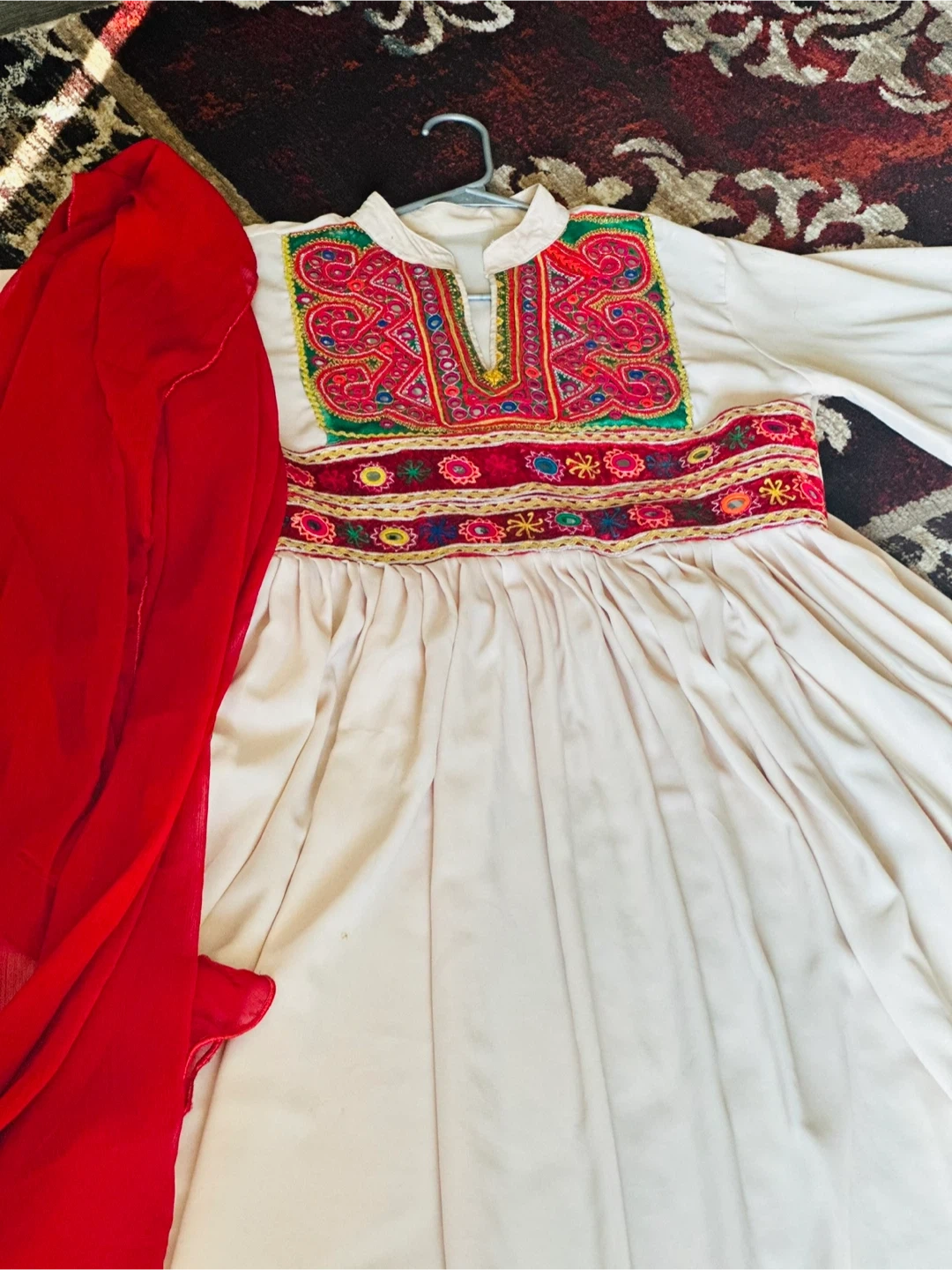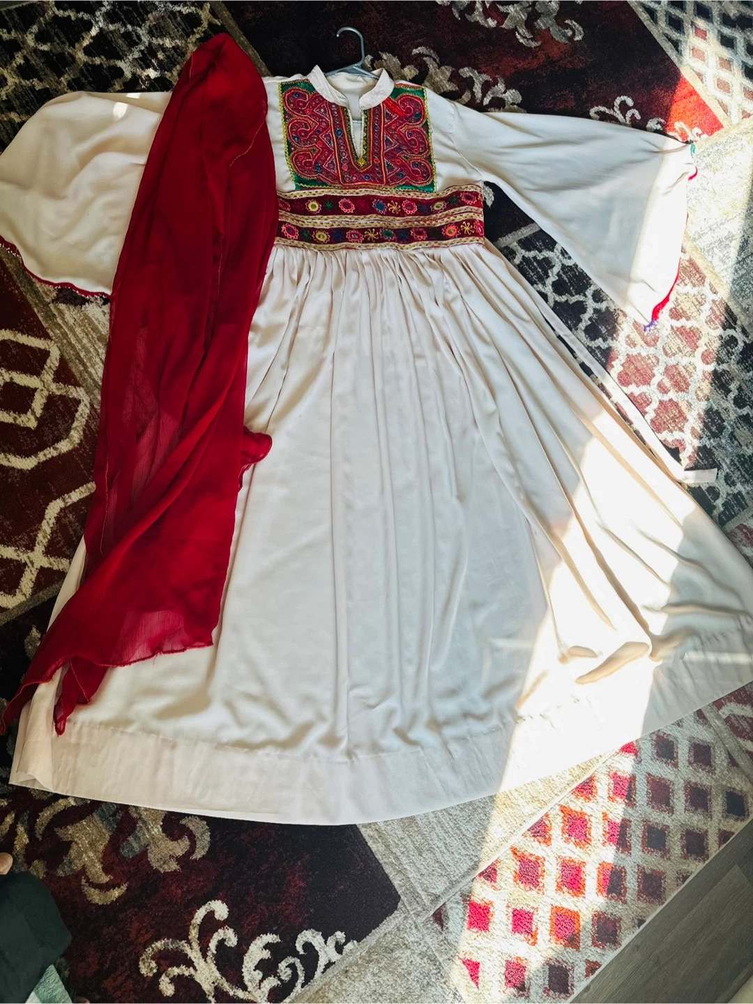 73Beautiful Afghan traditional dress with a matching red shawl. The dress features intricate embroidery and detailing around the neckline and waist. It's a unique and elegant piece, perfect for special occasions or cultural events. The dress is in great condition and ready to be worn!