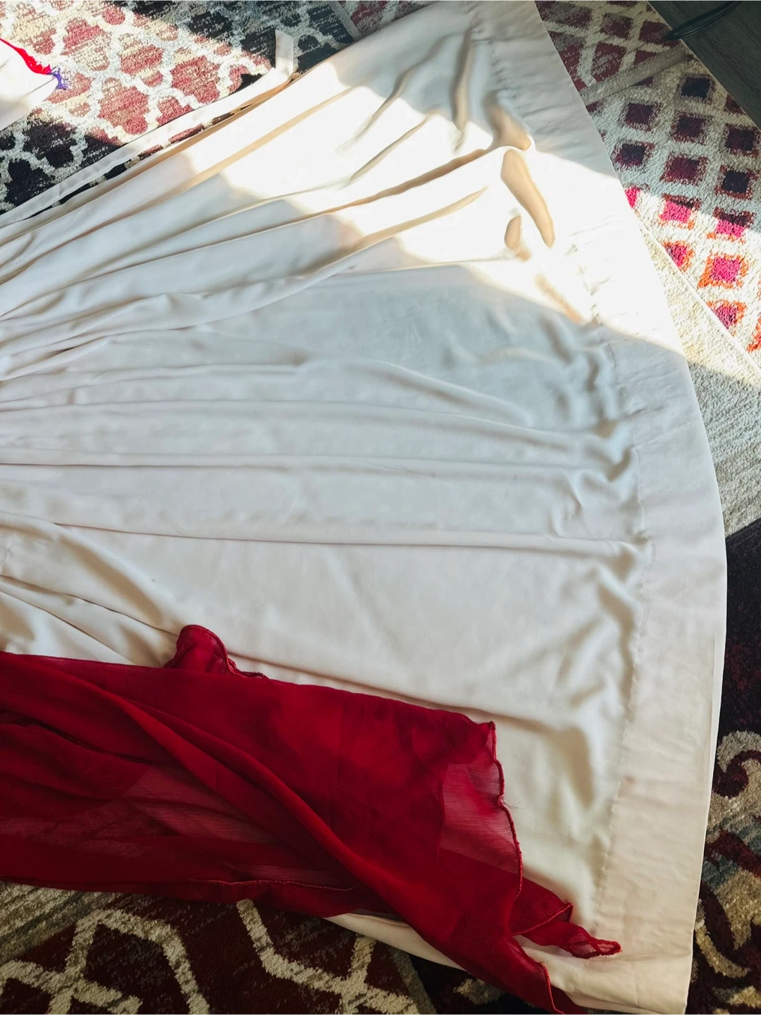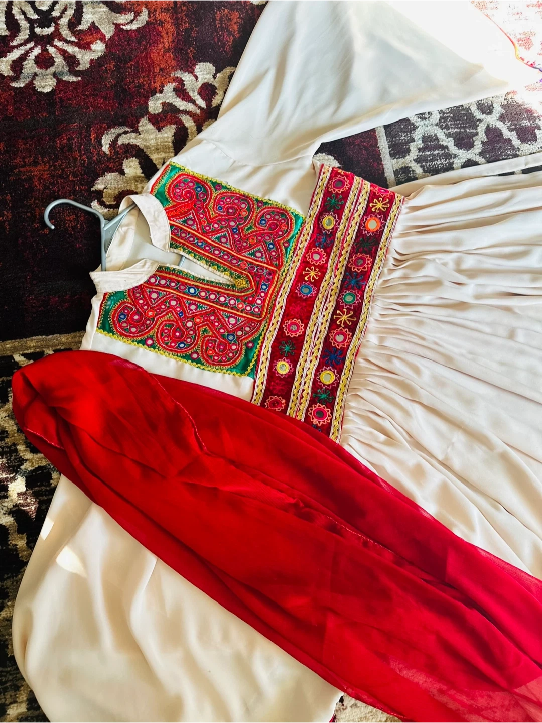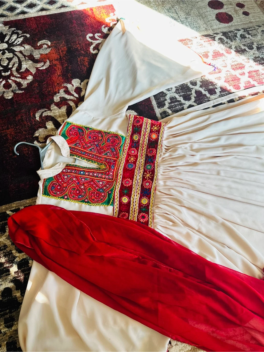 73Beautiful Afghan traditional dress with a matching red shawl. The dress features intricate embroidery and detailing around the neckline and waist. It's a unique and elegant piece, perfect for special occasions or cultural events. The dress is in great condition and ready to be worn!