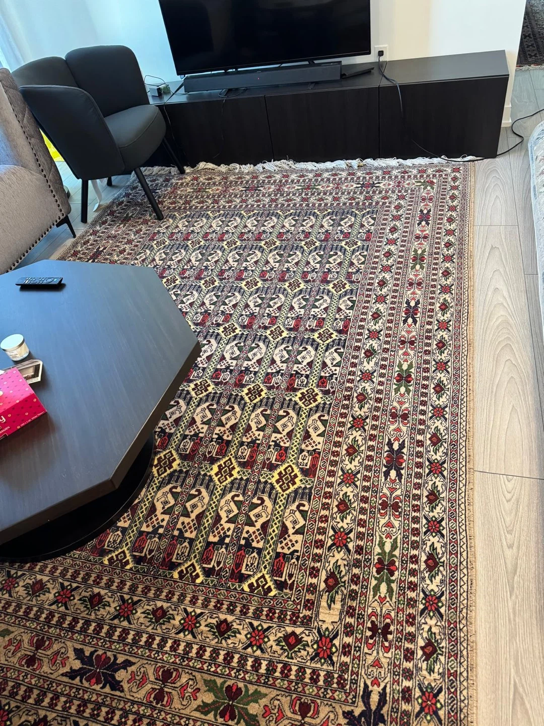 10This is a beautiful Afghani rug with a unique pattern. It would add a touch of elegance to any room. The rug is in great condition and has been well cared for. It features a detailed design with repeating motifs and a vibrant colour palette. Perfect for adding warmth and style to your home!