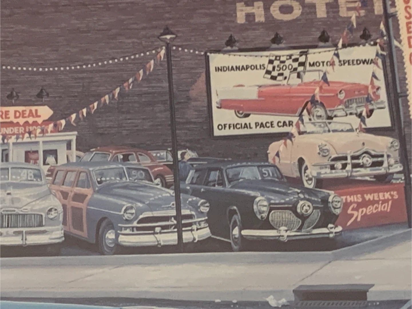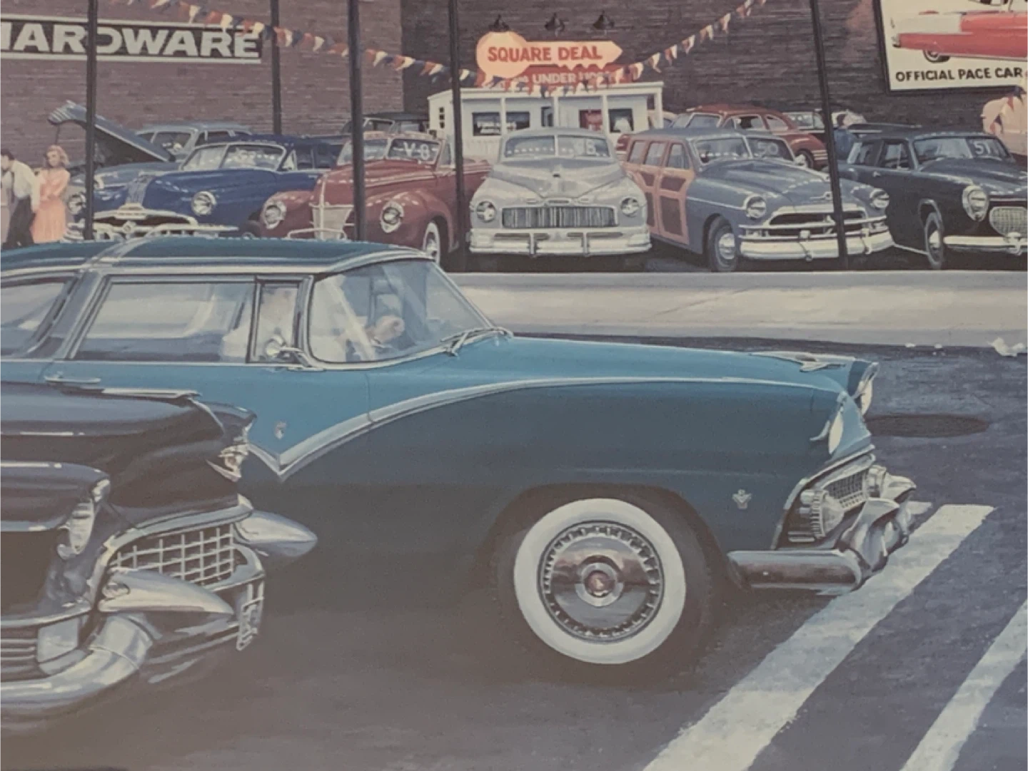 About the Artwork “Square Deal Used Cars” showcases a vibrant vintage car lot filled with classic automobiles from the golden era of the 1950s through the muscle-car years. Snyder’s work is beloved by collectors for its storytelling, detail, and warm nostalgic feel that instantly transports you back in time.