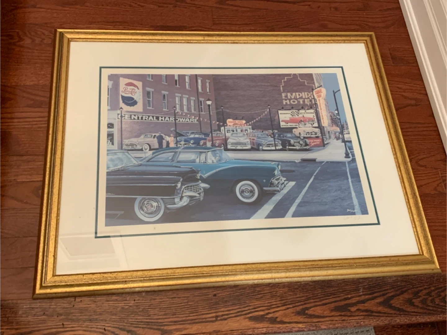Bring timeless Americana to your wall with this beautifully framed limited-edition print by renowned artist David (Dave) Snyder. Known for his incredibly detailed and nostalgic street scenes, Snyder perfectly captures the charm of classic American car culture.