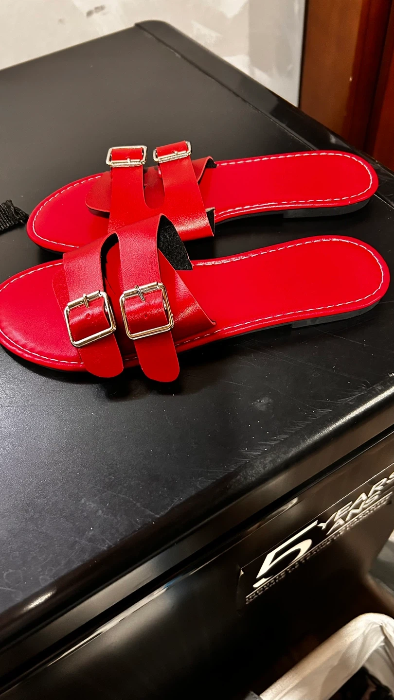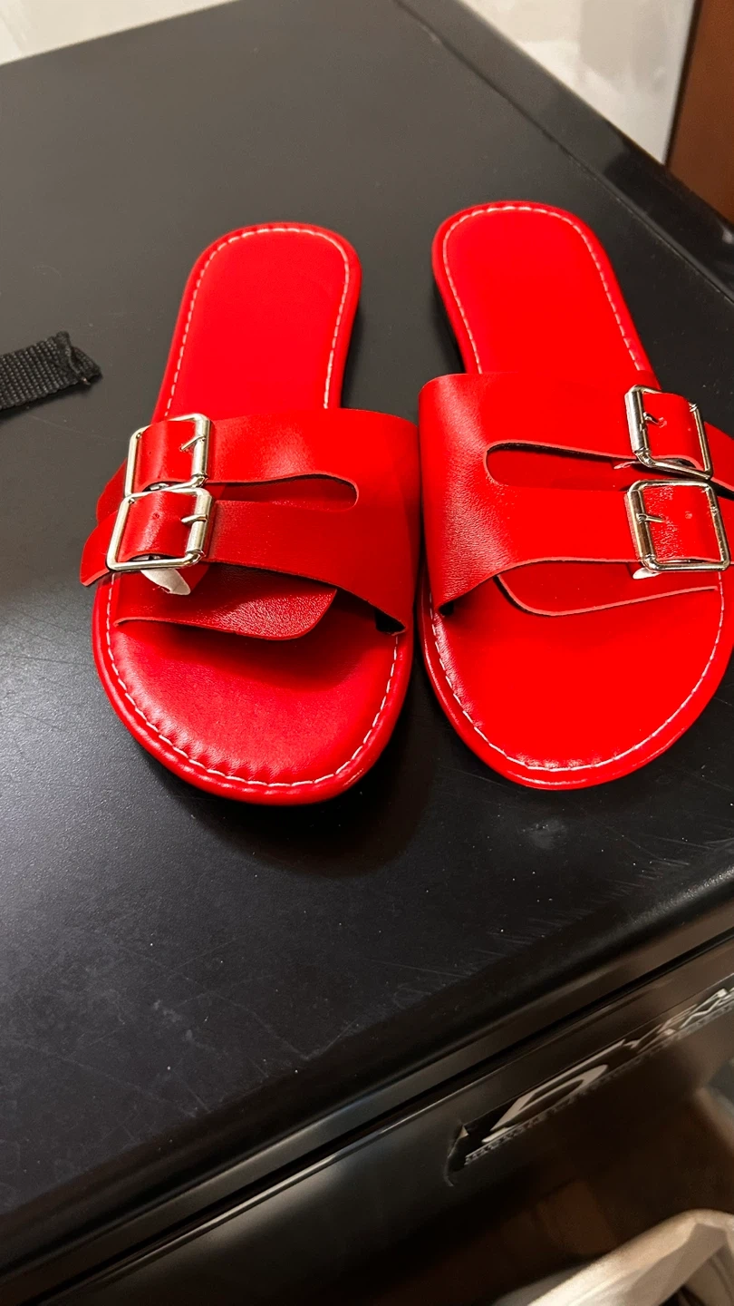 These bright red slide sandals feature a stylish double strap design with silver buckles. The synthetic material offers a smooth finish. Perfect for adding a pop of colour to any casual outfit!