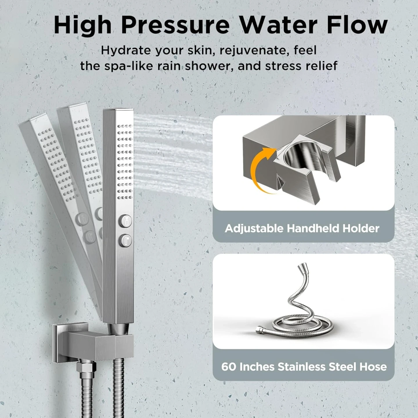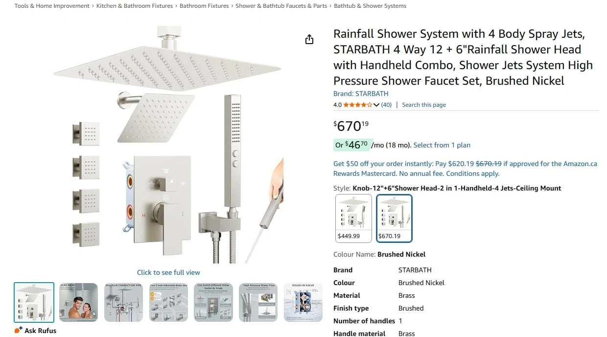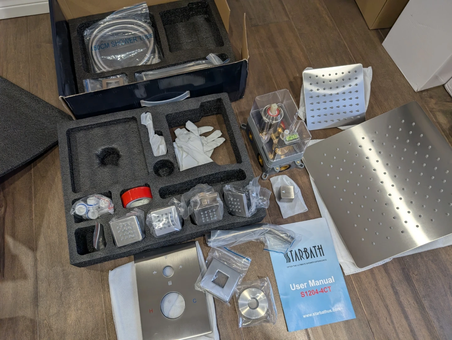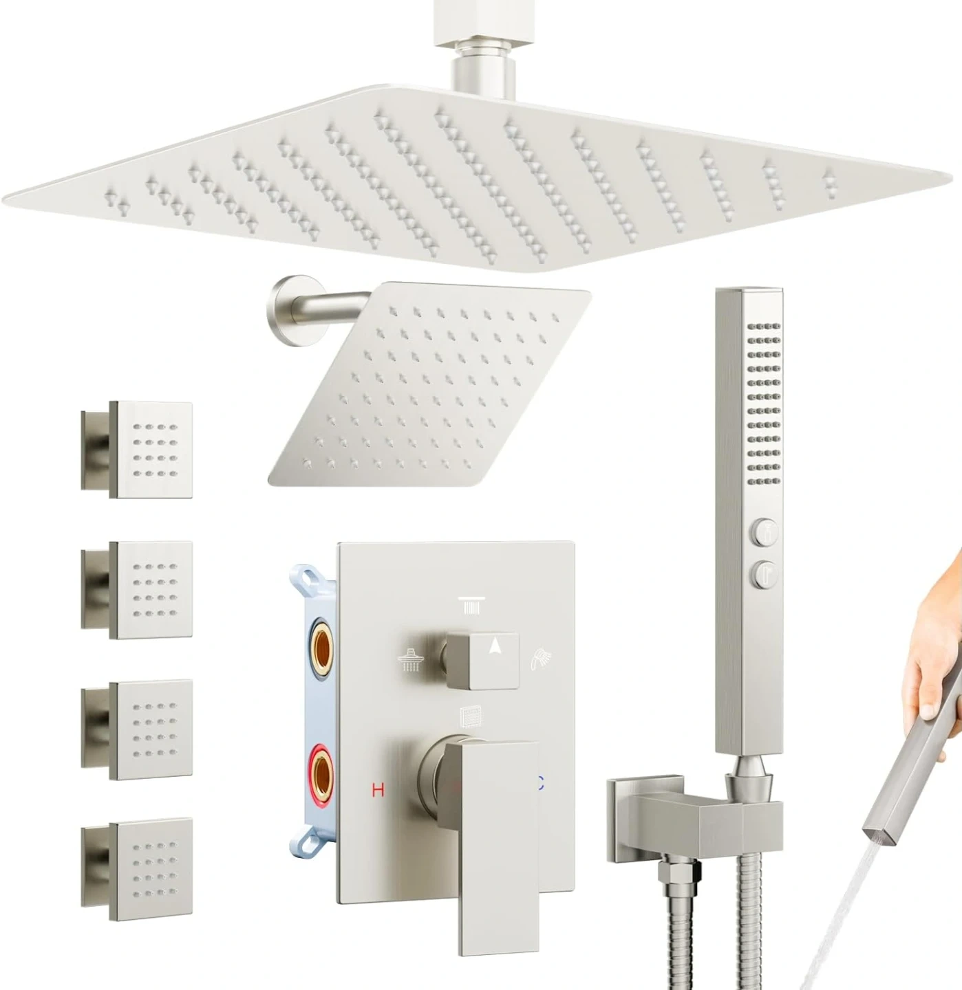 Brand new Starbath brushed nickel square 4 way shower head faucet kit for sale. 12” and 6” inch rainfall high pressure showerheads, shower head arm, pressure balanced valve cartridge, handle trim kit, hand shower wand with hose, 4 body spray jets, full kit with everything needed, $240 FIRM.