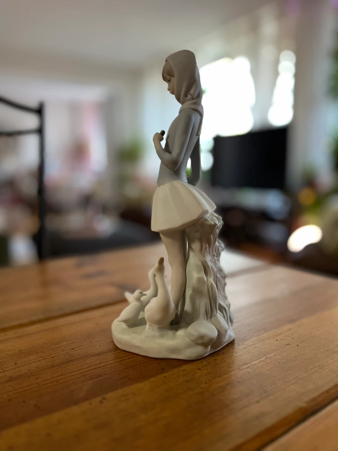 Young Girl with a basket tending to her geese is this "LLADRO GIRL WITH UMBRELLA & GEESE" FIGURINE