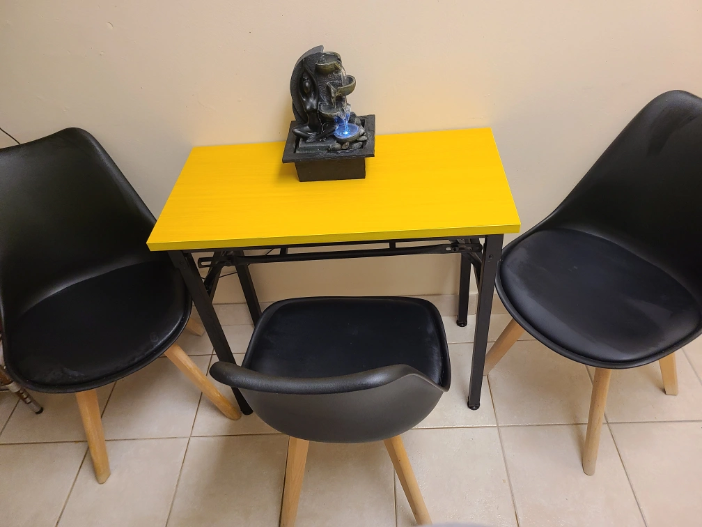 Selling a table and chairs set. The chairs are black with wooden legs, and the table has a bright yellow top. It's a great set for a small space or a cozy corner in your home!.. Free table matching table cloth.. 3 ft W 16 H 29 price firm