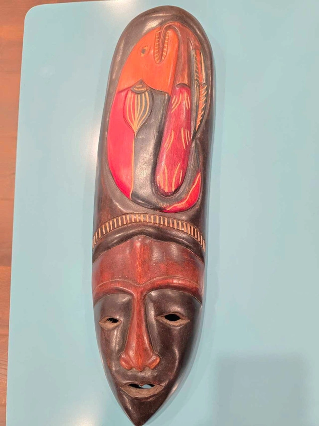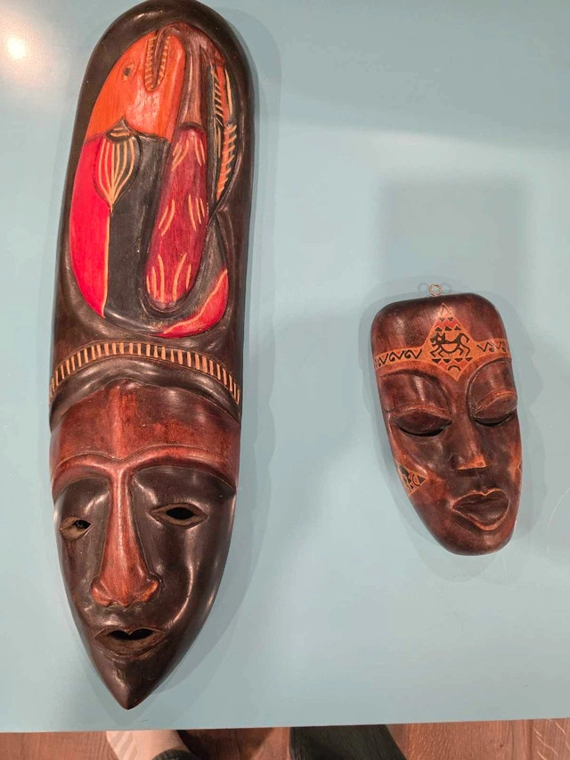 Add a touch of global culture to your home with this pair of used, hand-carved African masks. The larger mask features an elongated design with vibrant red accents, while the smaller one showcases intricate facial detailing. These masks embody traditional craftsmanship and have been well-preserved. Perfect for collectors or anyone looking to enhance their decor with unique, cultural art. * Material: Wood * Larger Mask Dimensions: Approximately 45cm in length * Smaller Mask Dimensions: Approximately 20cm in length Let me know if you're interested!