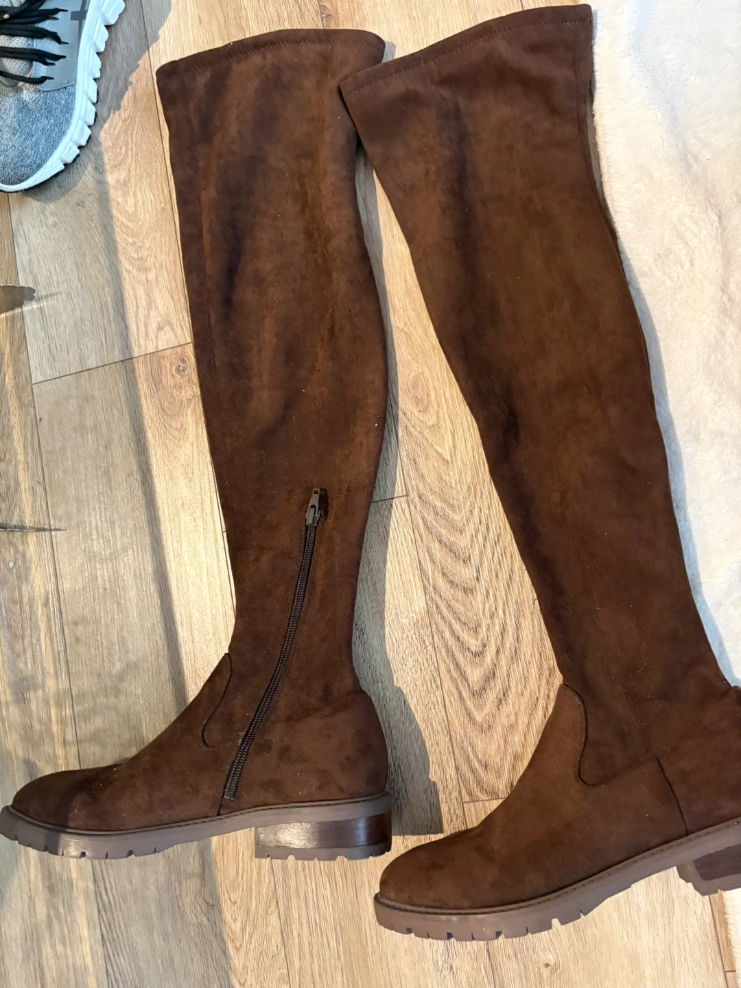 Brand new Steve Madden Women's brown over-the-knee boots. These boots have a side zipper closure and a lug sole. They're made from a soft, suede-like material. These are great for fall and winter weather! Size 8