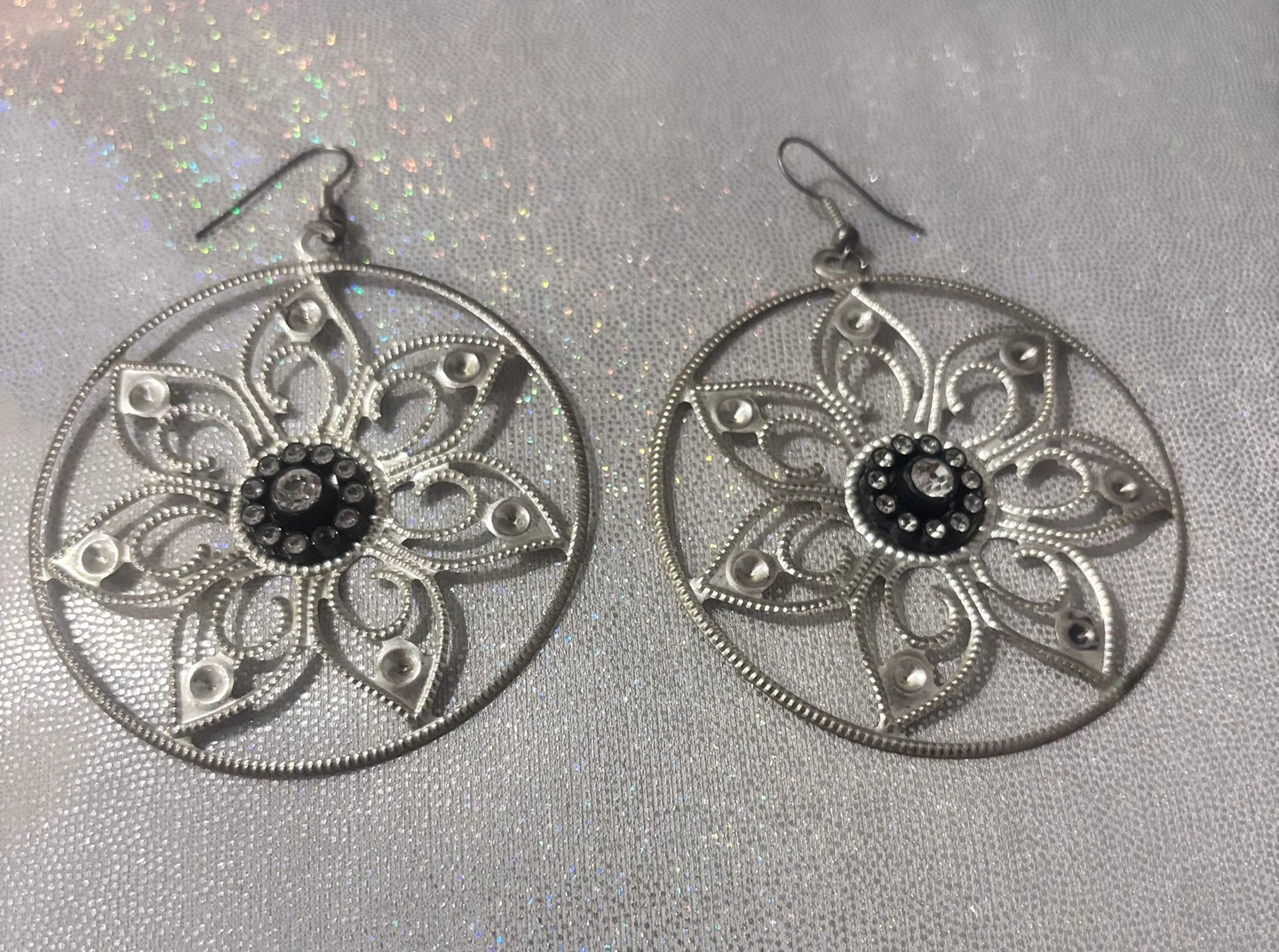 Elevate your look with this elegant Ann Taylor sheer black lace top, paired with a stunning set of silver-toned floral statement earrings for an effortless dressy vibe. The top features delicate lace detailing with a semi-sheer finish, perfect for layering over a camisole or styling under a blazer. Made in the USA with a soft nylon-rayon blend, it has a refined, timeless feel. The earrings are lightweight, eye-catching, and ideal for evenings out, dinners, or special occasions. Bundle includes: Ann Taylor black lace sheer top (dry clean only) and silver-toned floral drop earrings. Perfect for date night, cocktail events, or dressed-up casual looks. Gently worn, no major flaws noted.
