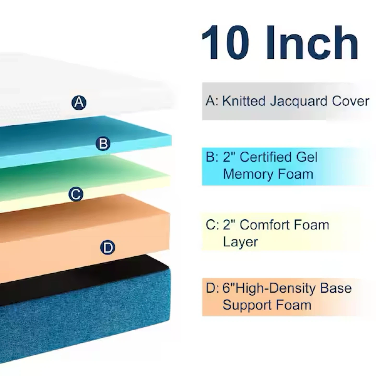 Selling a Molblly 10-inch memory foam queen mattress. It features a knitted jacquard cover, 2-inch certified gel memory foam, a 2-inch comfort foam layer, and a 6-inch high-density base support foam. It's skin-friendly, easy to clean, and breathable!