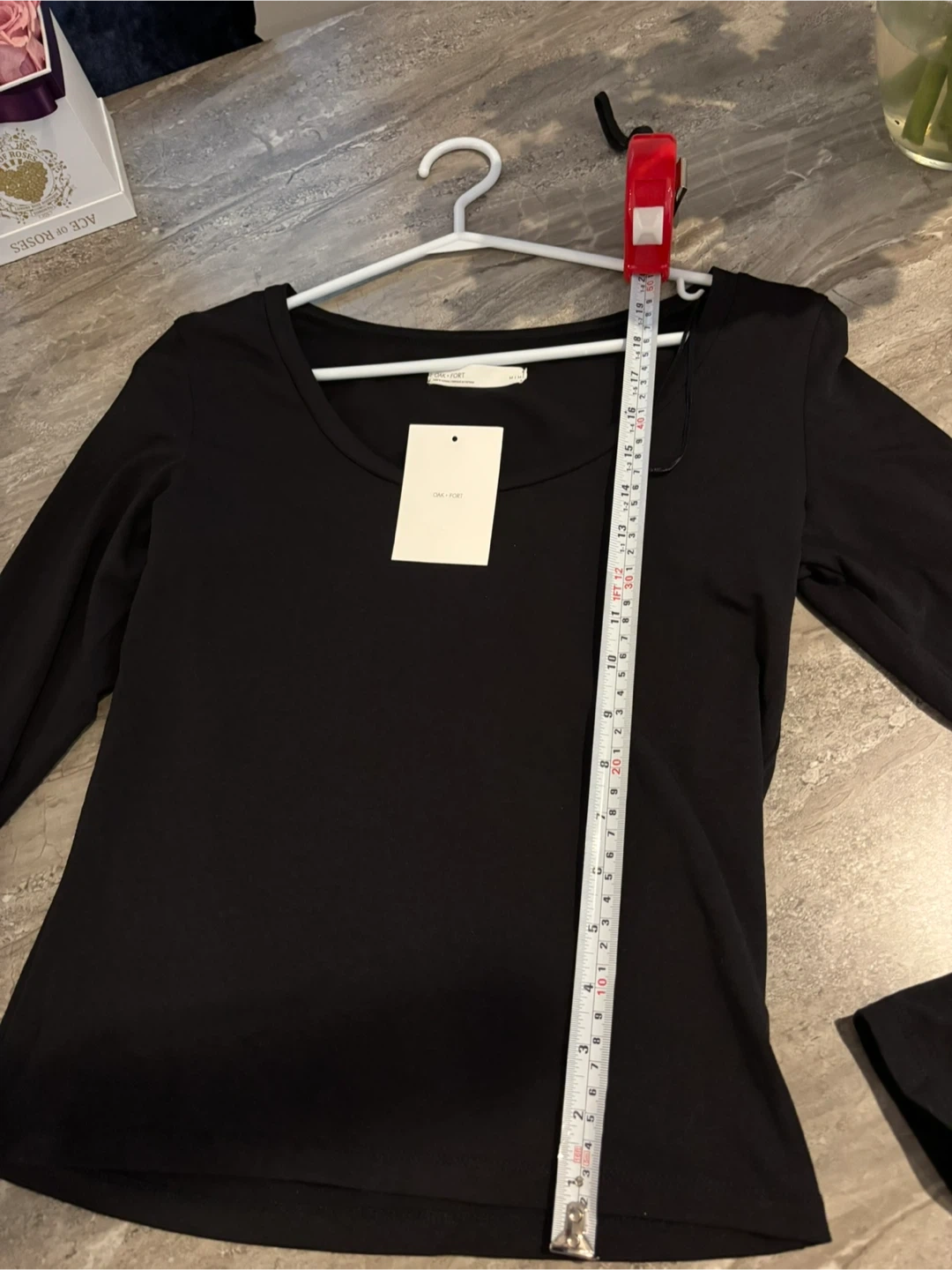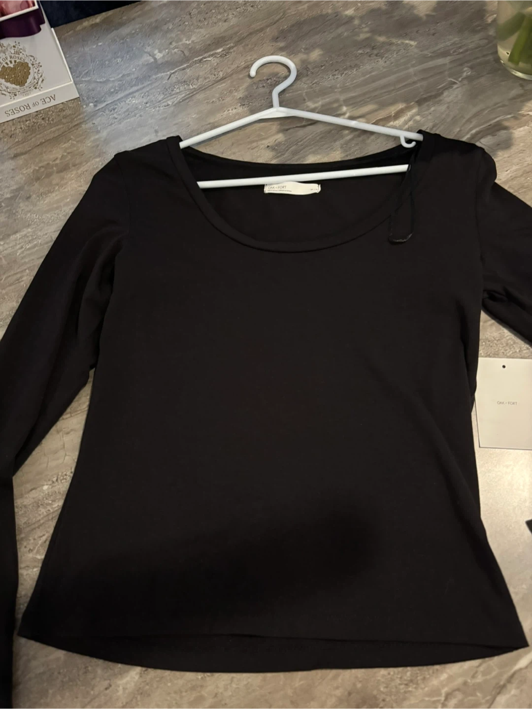 This is a new, never-worn Oak and Fort black long sleeve top, size medium. The sleek design and comfortable fit make it a versatile addition to any wardrobe.