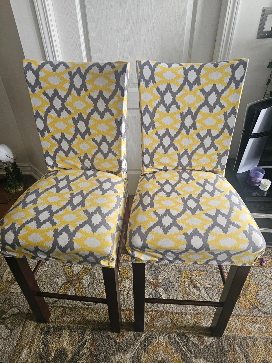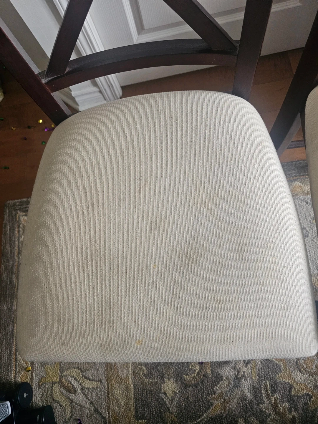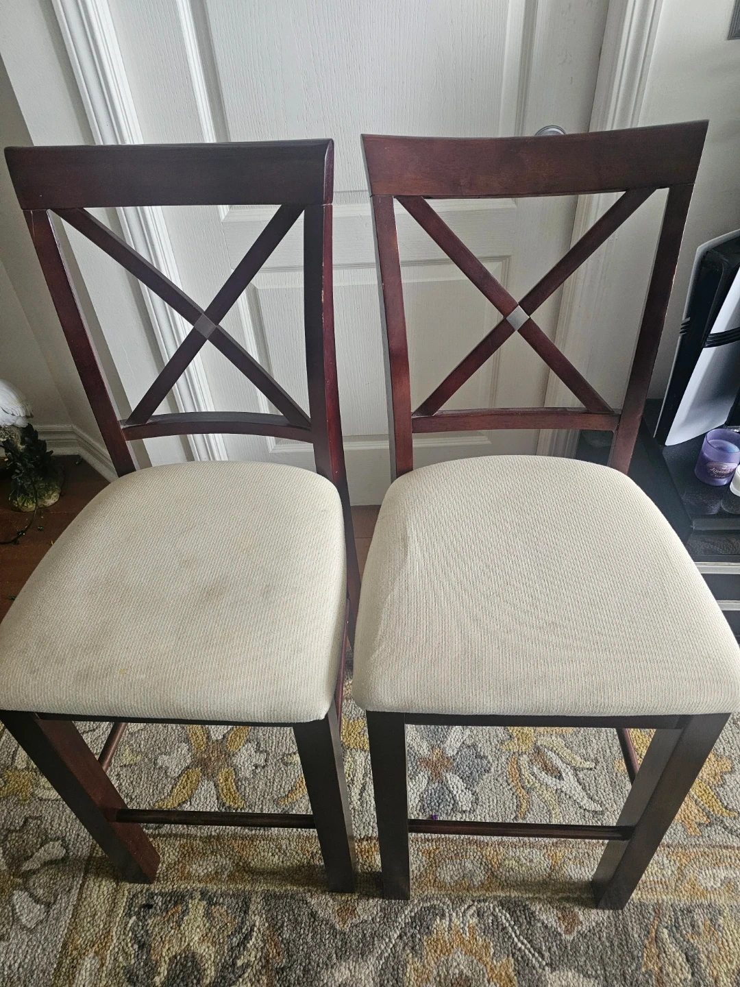 Used sparingly. In great condition except some marks of spillage on the seat (as shown in the picture) which can be cleaned. Happy to add the chairs covers for FREE should the buyer like them. The chairs have an old time charm to them, slightly antique in character. You will love them when you see them.