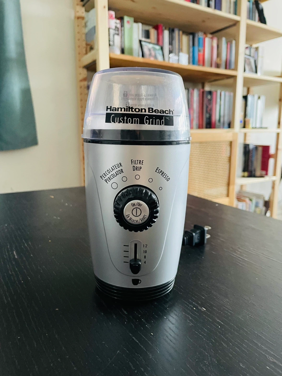 Hamilton Beach coffee grinder. Multiple settings for different cup sizes and coffee types. Cable can be rolled and hidden at the bottom when grinder is not used. Brush (slotted in the back) for cleaning.
