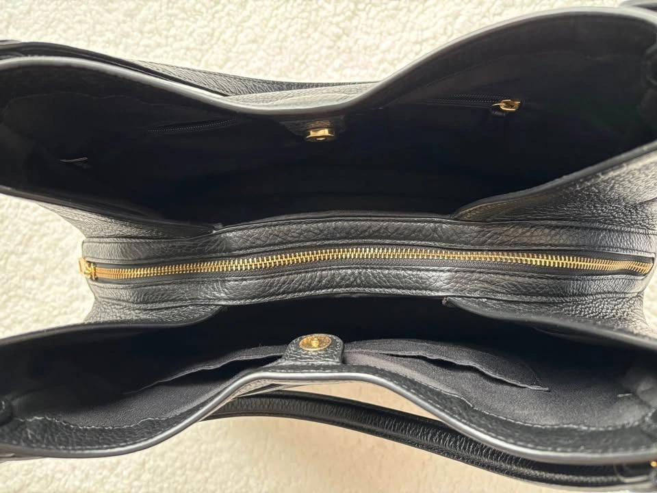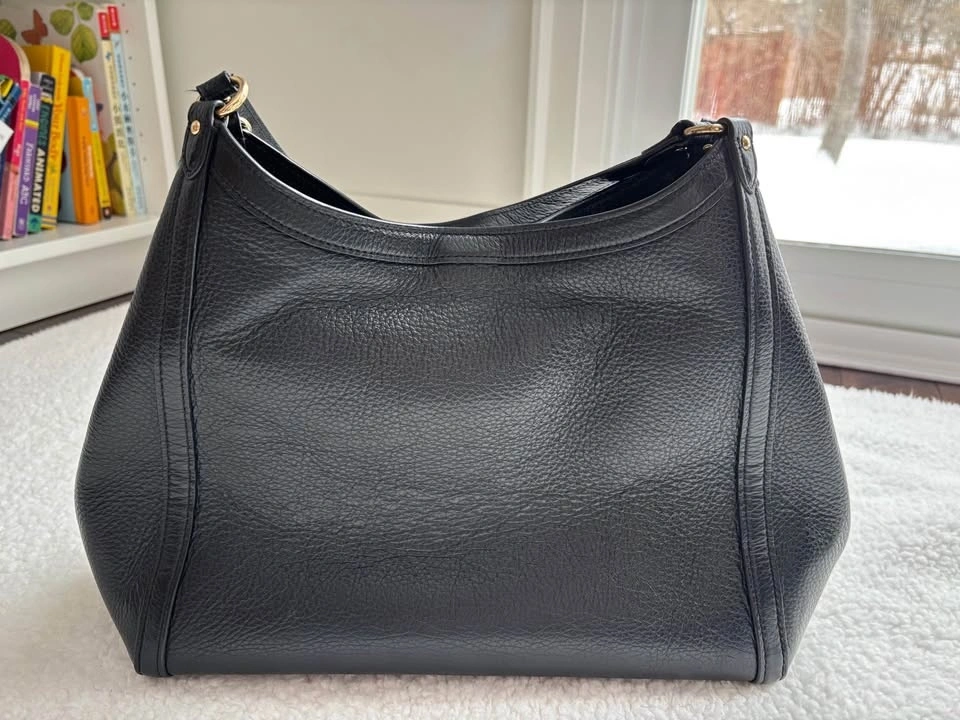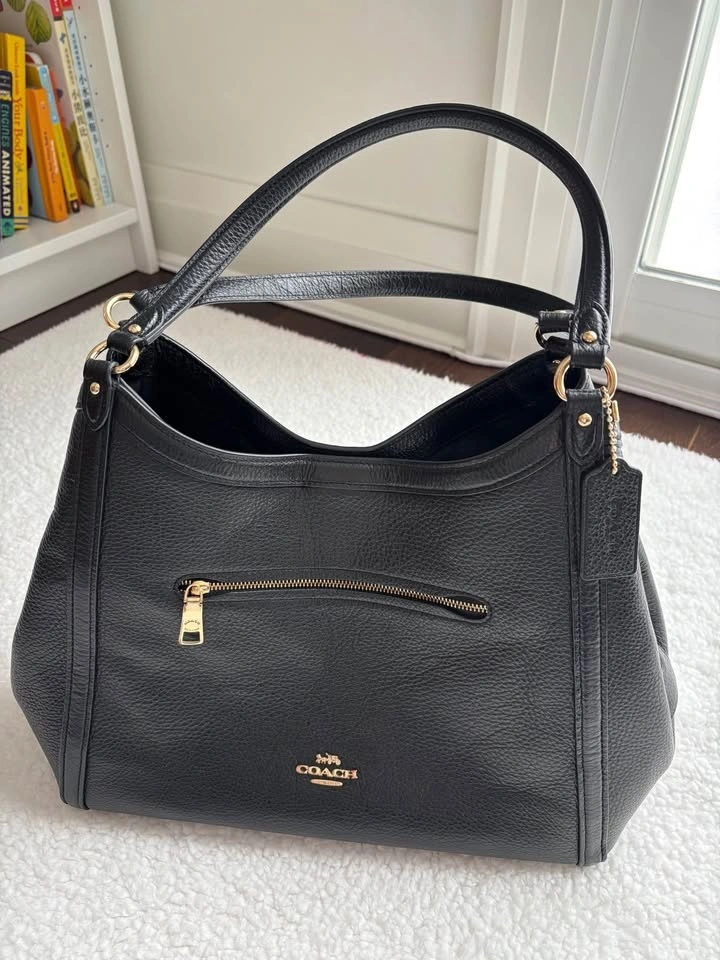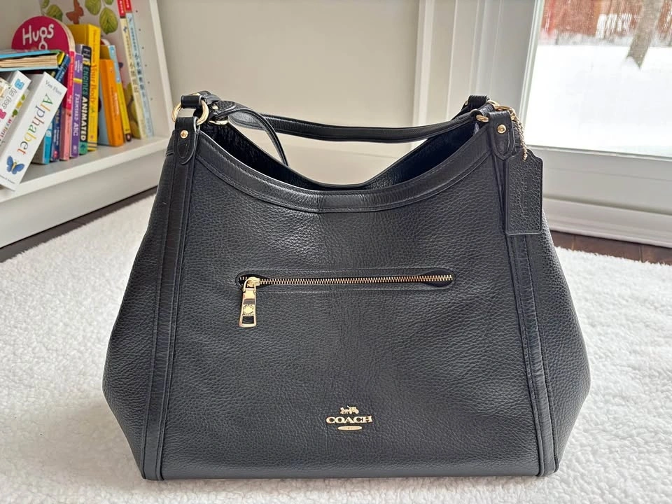 Snap Closure Coach Women's Kristy Shoulder Bag Black Smooth Leather Gold-Tone Hardware. Interior Detail: Zip Pocket, Fabric Lining, Center Zip Compartment, Cell phone, and Multifunction Pockets. Handles Drop 9 1/2". Dimention: 12 1/2" (L) x 10 3/4" (H) x 5 3/4" (W). Sold out online and in stores.