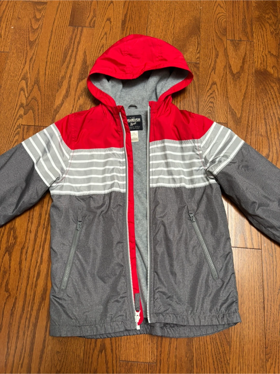 This OshKosh B'gosh jacket features a red and grey colour block design with white stripe accents. It has a full zip closure and two zip pockets. The interior is lined with soft grey fleece for added warmth. This jacket is perfect for layering on cooler days.