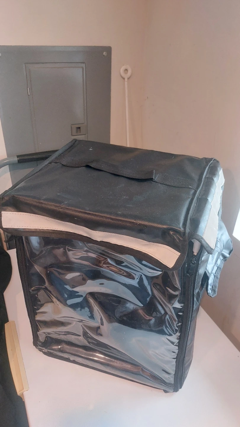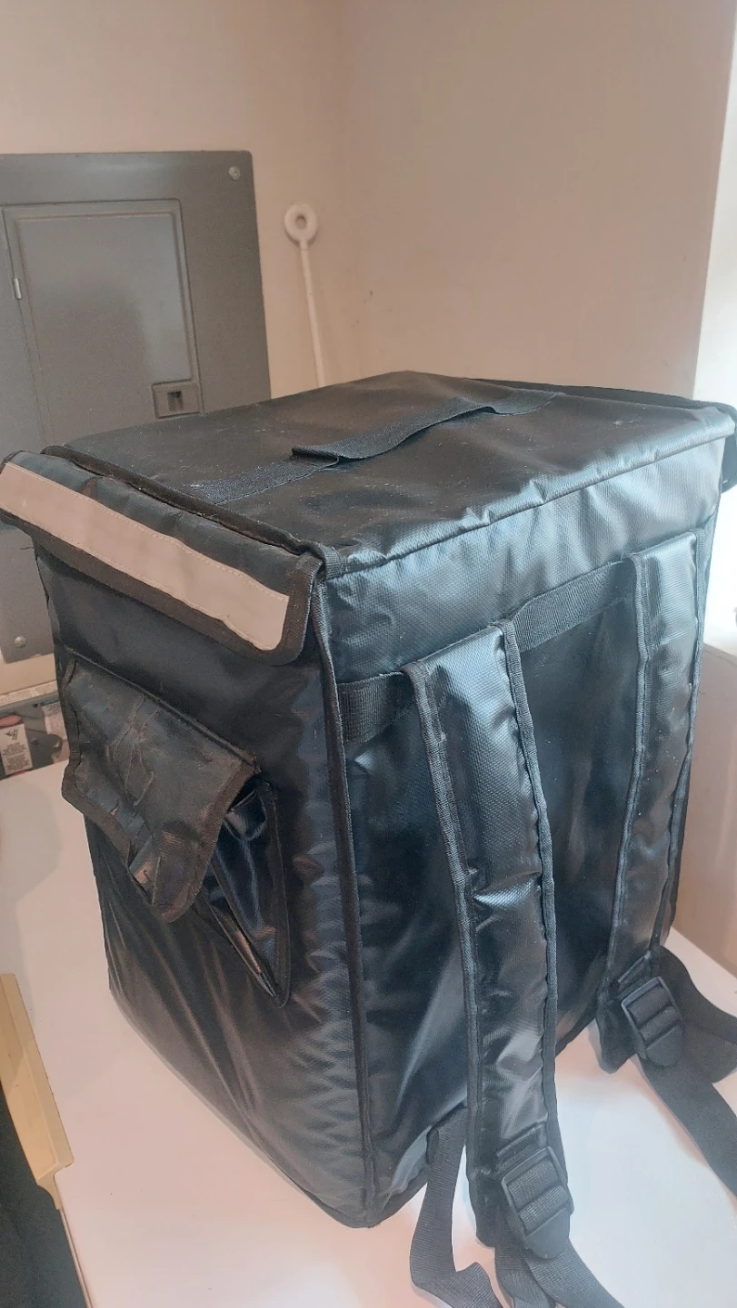 Black insulated backpack for food delivery. It has adjustable shoulder straps for comfort. The interior is lined with reflective material to keep food warm or cold. Exterior is durable nylon.