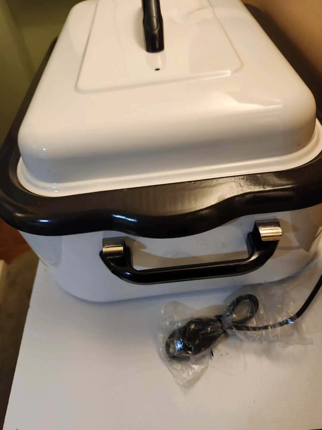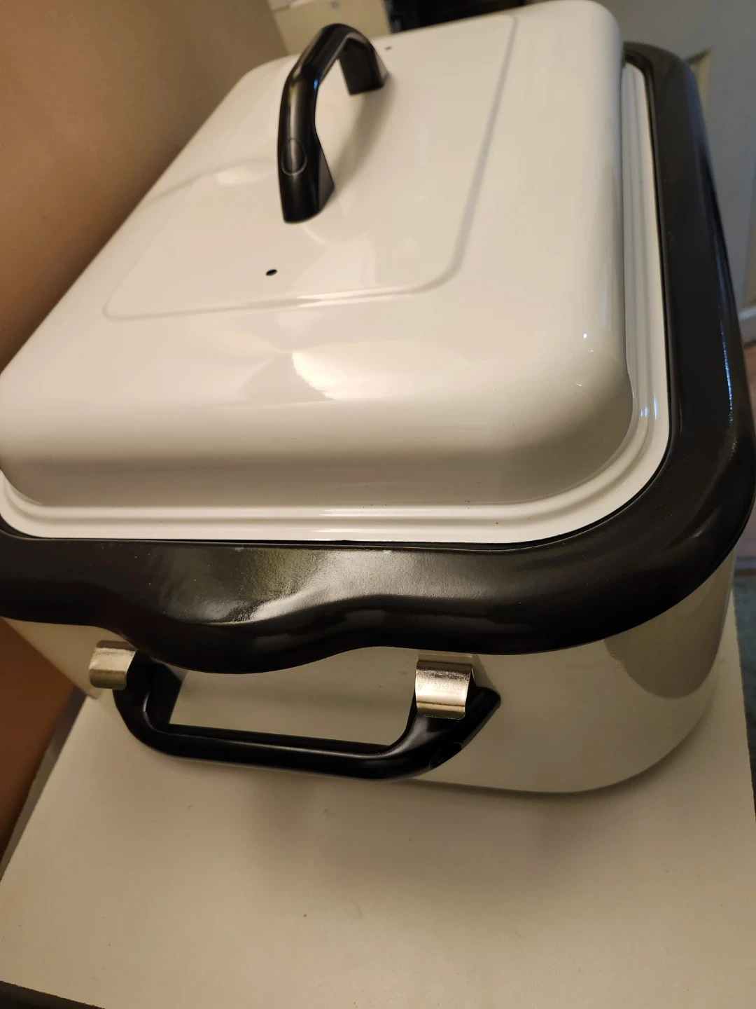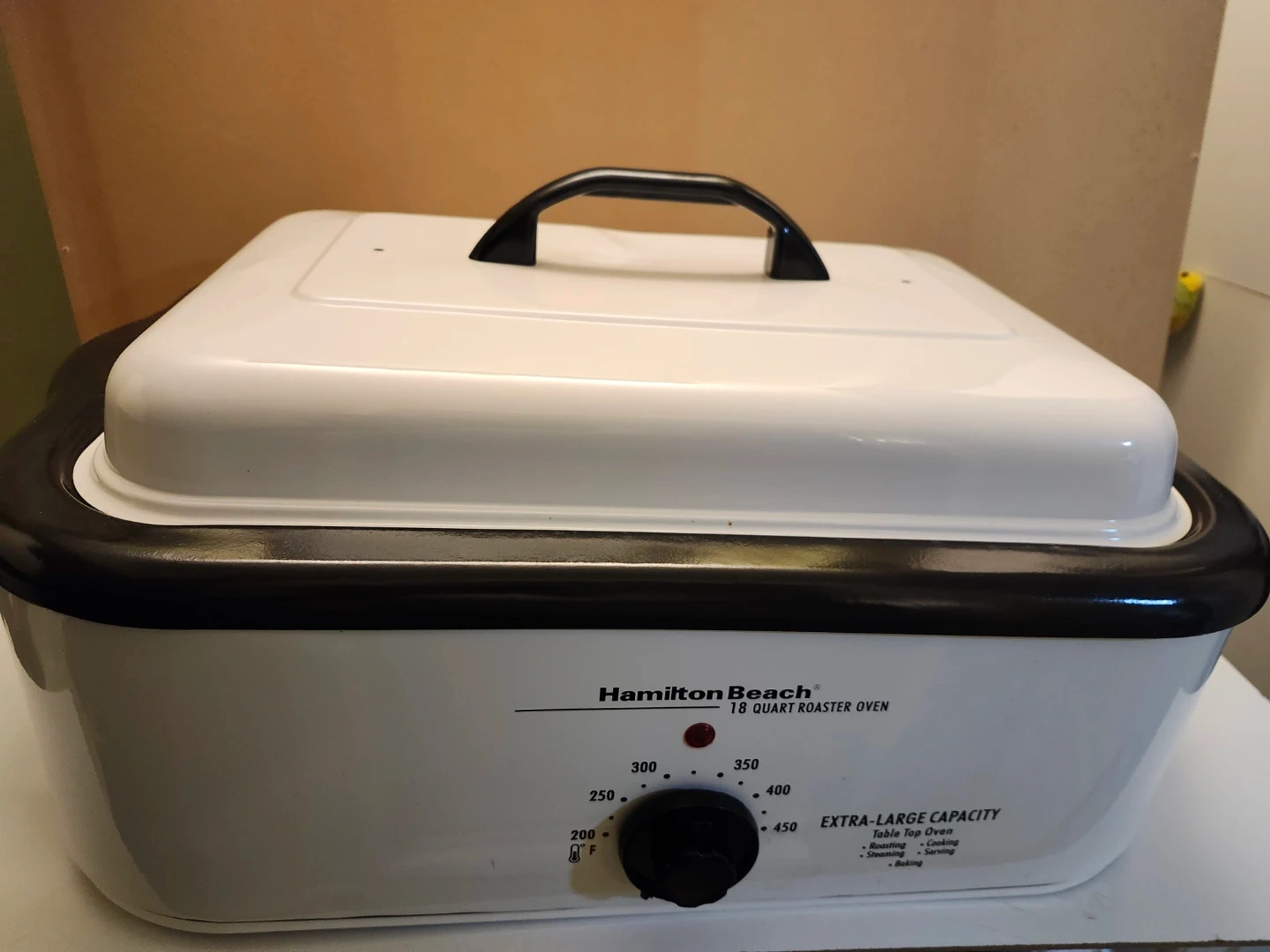 Never be used, This Hamilton Beach roaster oven is extra-large capacity at 18 quarts. It's white with a black trim and lid handle. The temperature goes from 200 to 450 degrees Fahrenheit and it's suitable for roasting, cooking, steaming, slow cooking, and baking. It's a versatile countertop appliance for any kitchen!. Price firm only cash only pickup no delivery 801 O'Connor drive outside TD Canada Trust bank door East York.