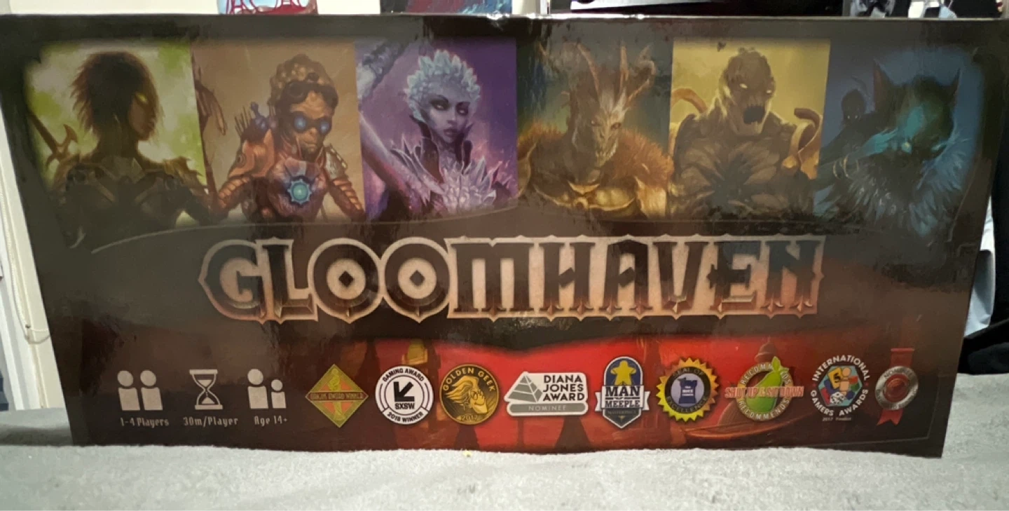 This is the Gloomhaven board game. It's designed for 1-4 players and takes about 30 minutes per player to complete. The recommended age is 14 and up. It has won several awards, including a Golden Geek award.