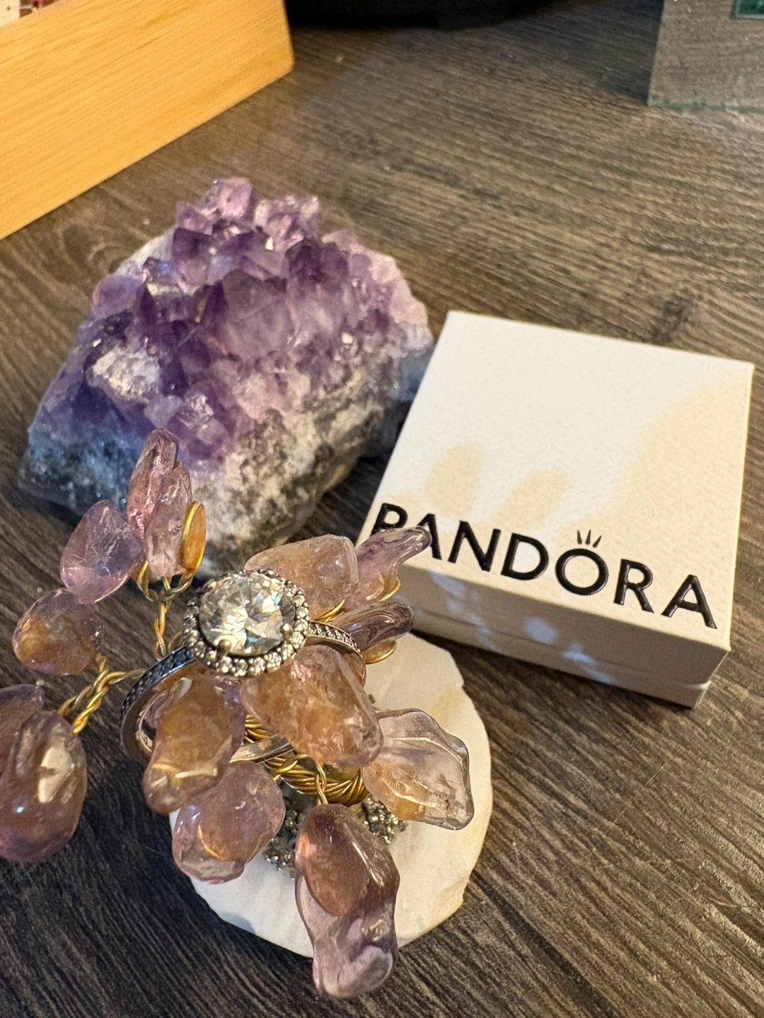 Pandora sterling silver ring featuring a round center stone surrounded by a halo of smaller stones. The band is also detailed with small stones. Includes original Pandora box.
