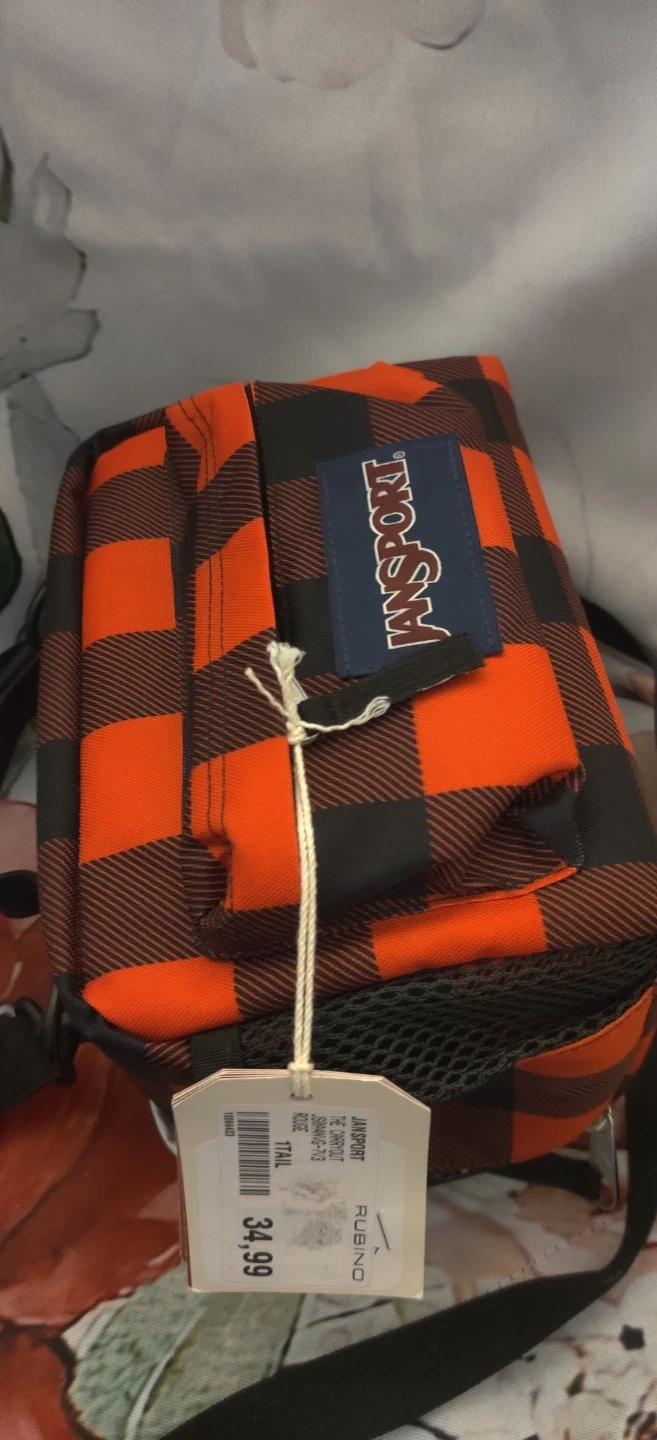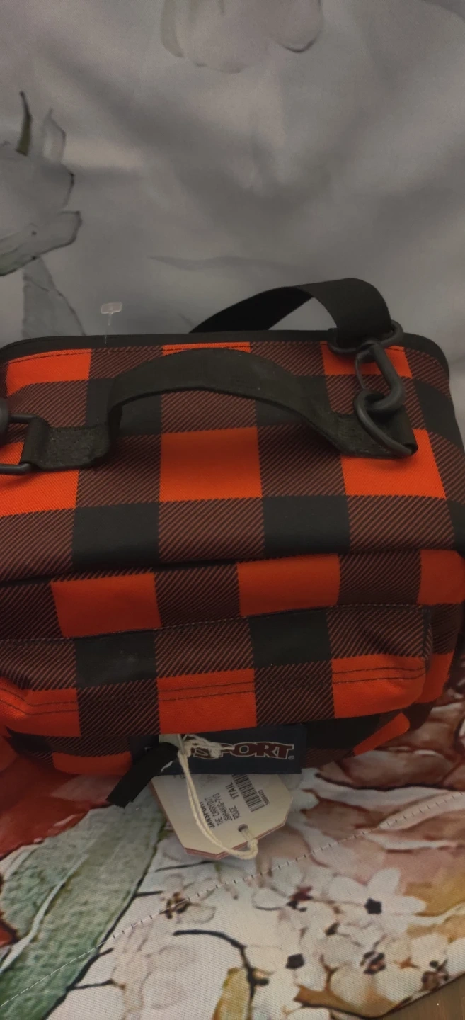 This is a Jansport lunch bag in a buffalo plaid pattern. It features a zippered main compartment and a top handle with an optional shoulder strap. Great for packing snacks or a lunch!10 inches wide