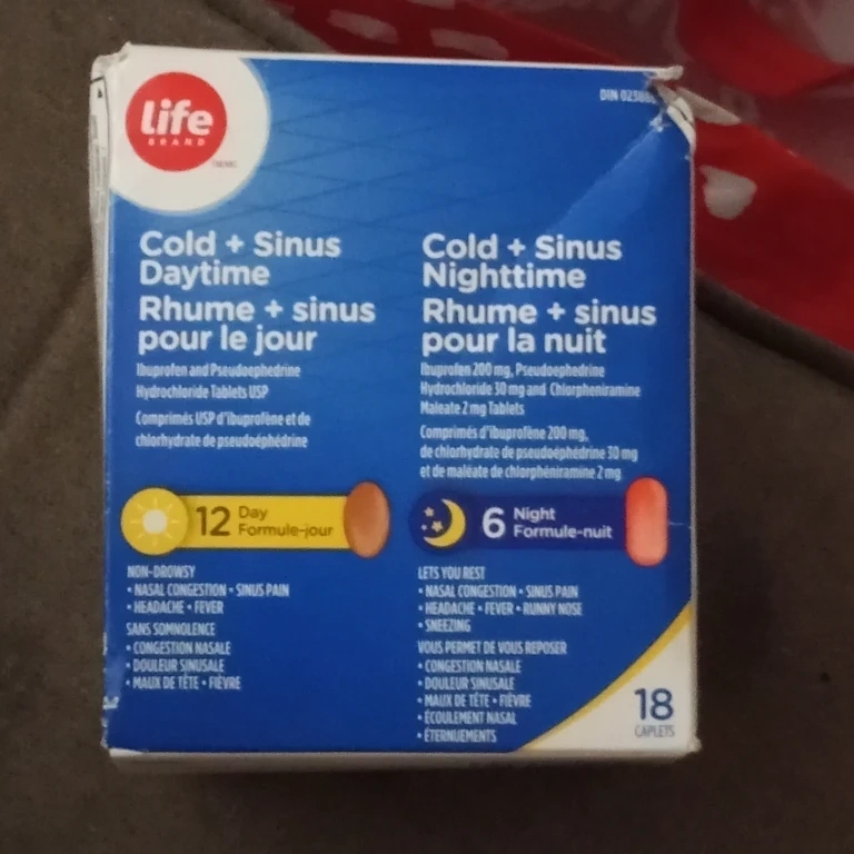 This box contains Life Brand Cold & Sinus Daytime and Nighttime caplets. Expiry is February 2026. It offers relief for nasal congestion, sinus pain, headaches, and sneezing.