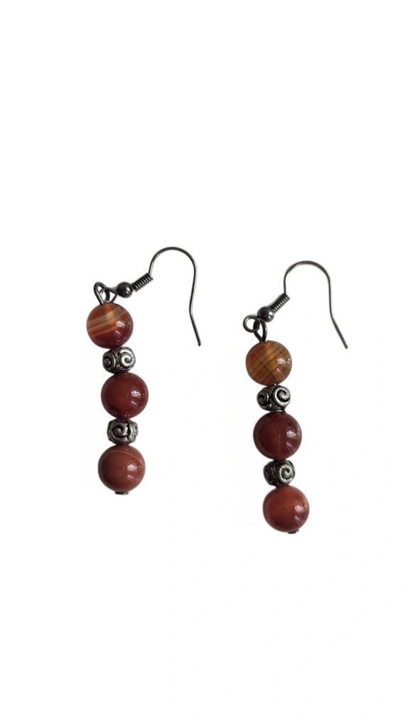 172A pair of drop earrings with red agate beads and silver spacer beads. The earrings have silver hooks.