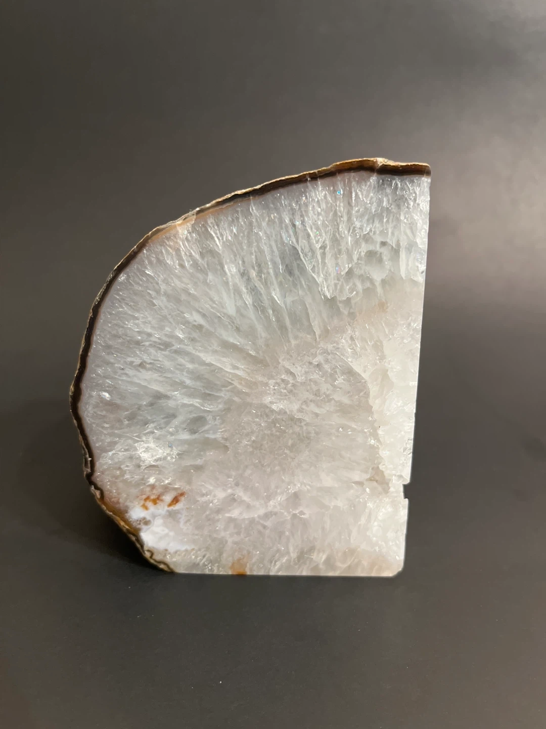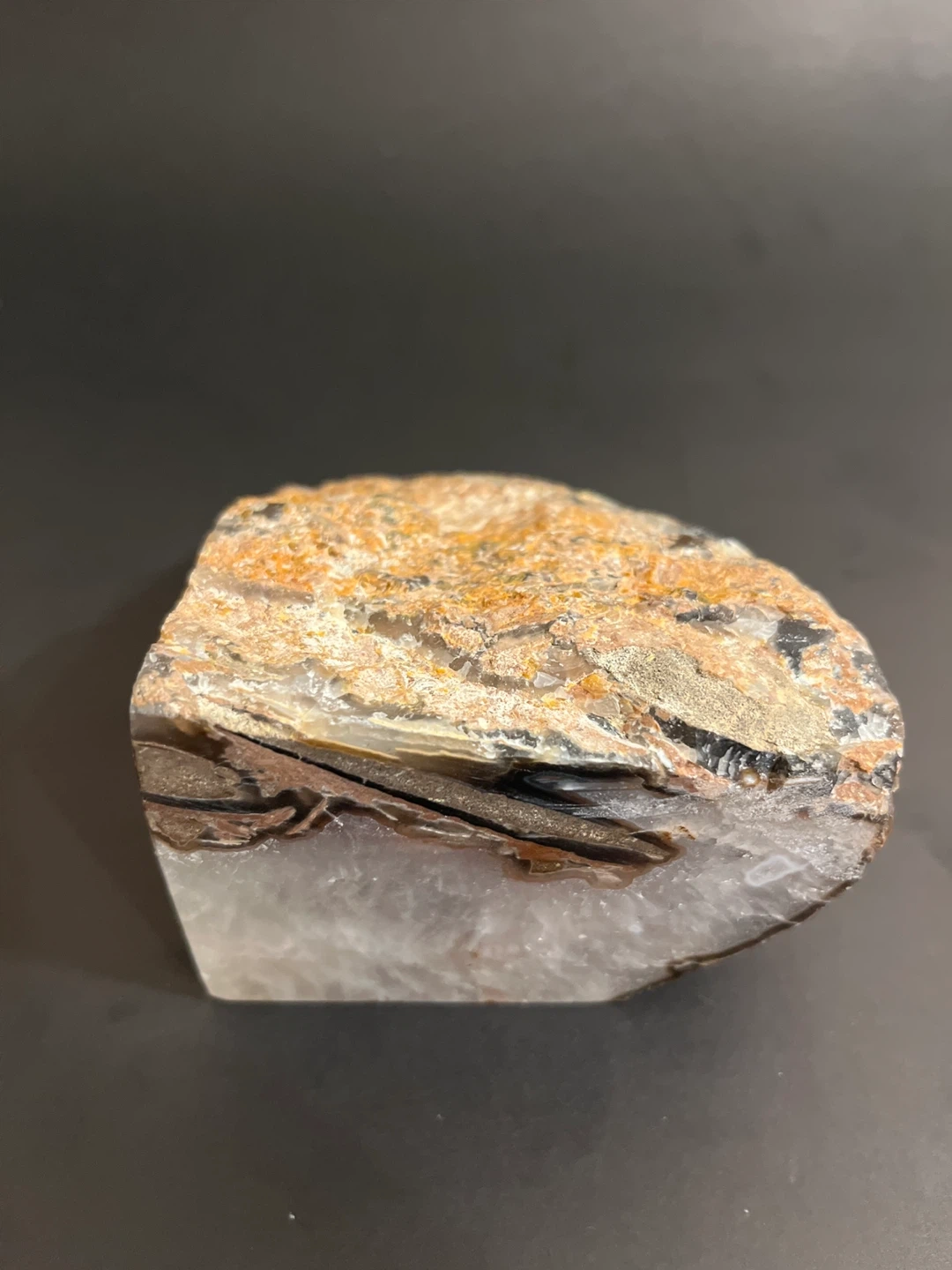 76Agate bookend, great for adding a natural touch to your bookshelf or desk. This captivating agate specimen showcases a mesmerizing blend of white, brown, and grey tones, making it a unique addition to any collection. This specimen is in used condition.