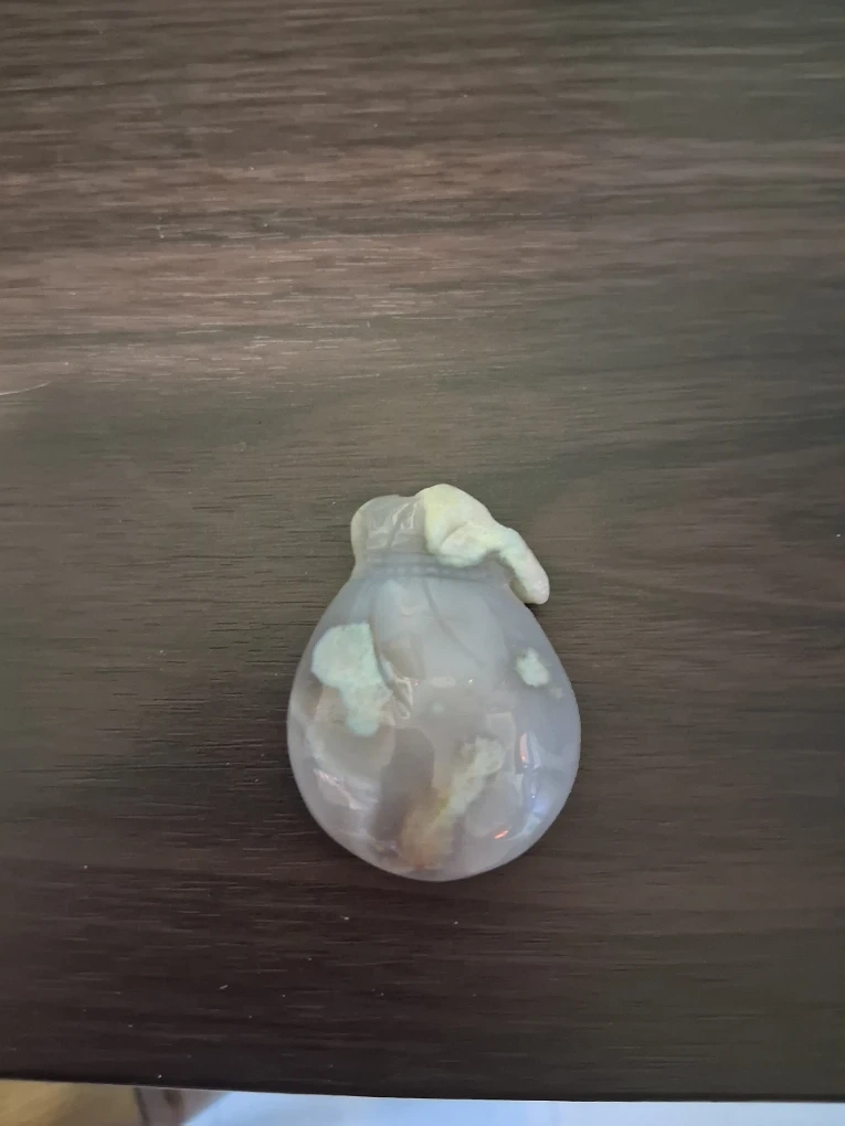 570Selling a beautiful agate chalcedony money bag carving, I like to call it the Santa Sac! It's a mineral variety known for its unique patterns and colours. This stone is also considered a healing stone.