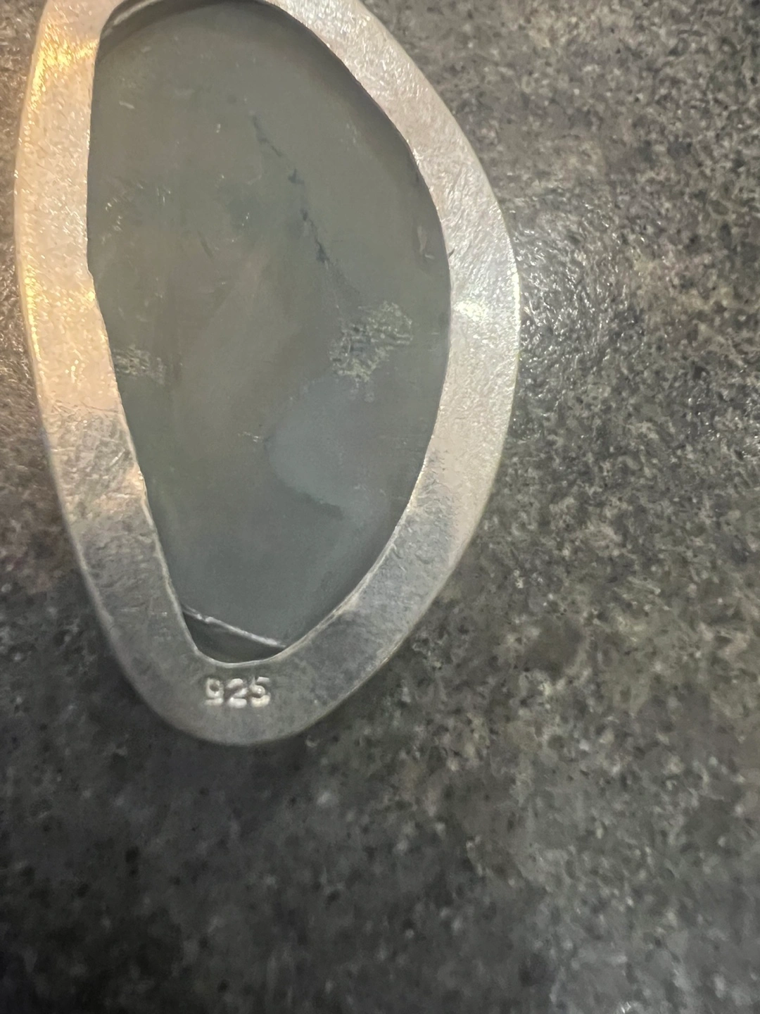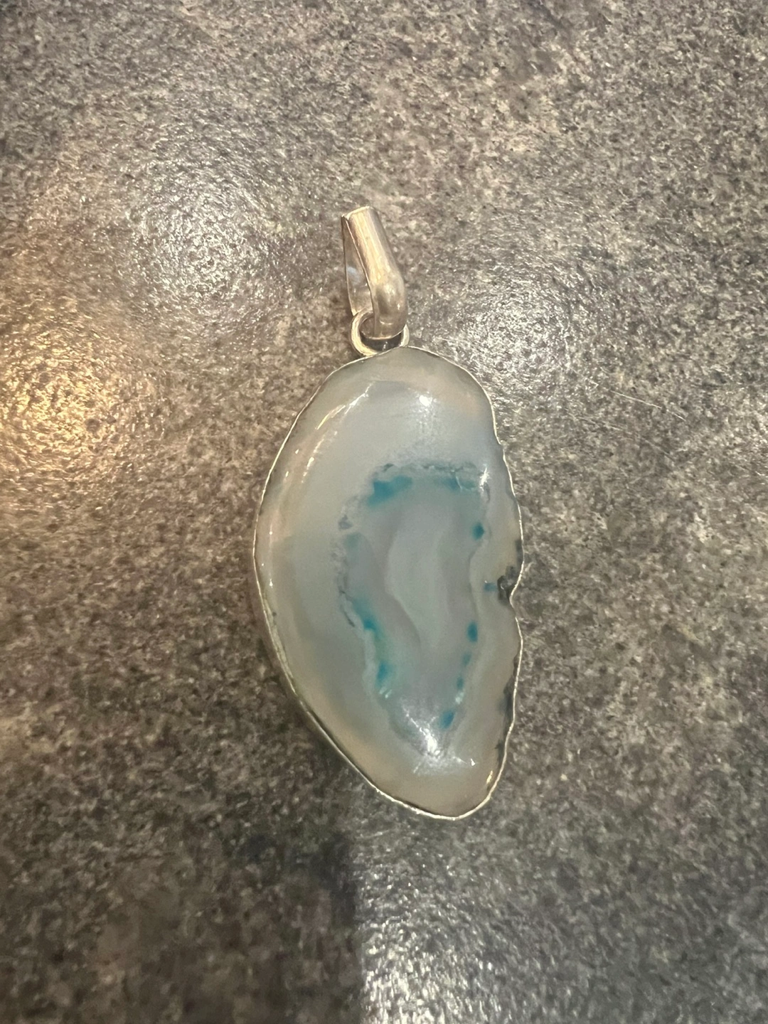 26A lovely agate pendant with a sterling silver (925) setting! It's in great condition and is very beautiful and unique. It’s stamped 925 and weighs a substantial 13.9g. It measures 4cm tall without the bale and 6cm talk with the bale. Great addition to any collection