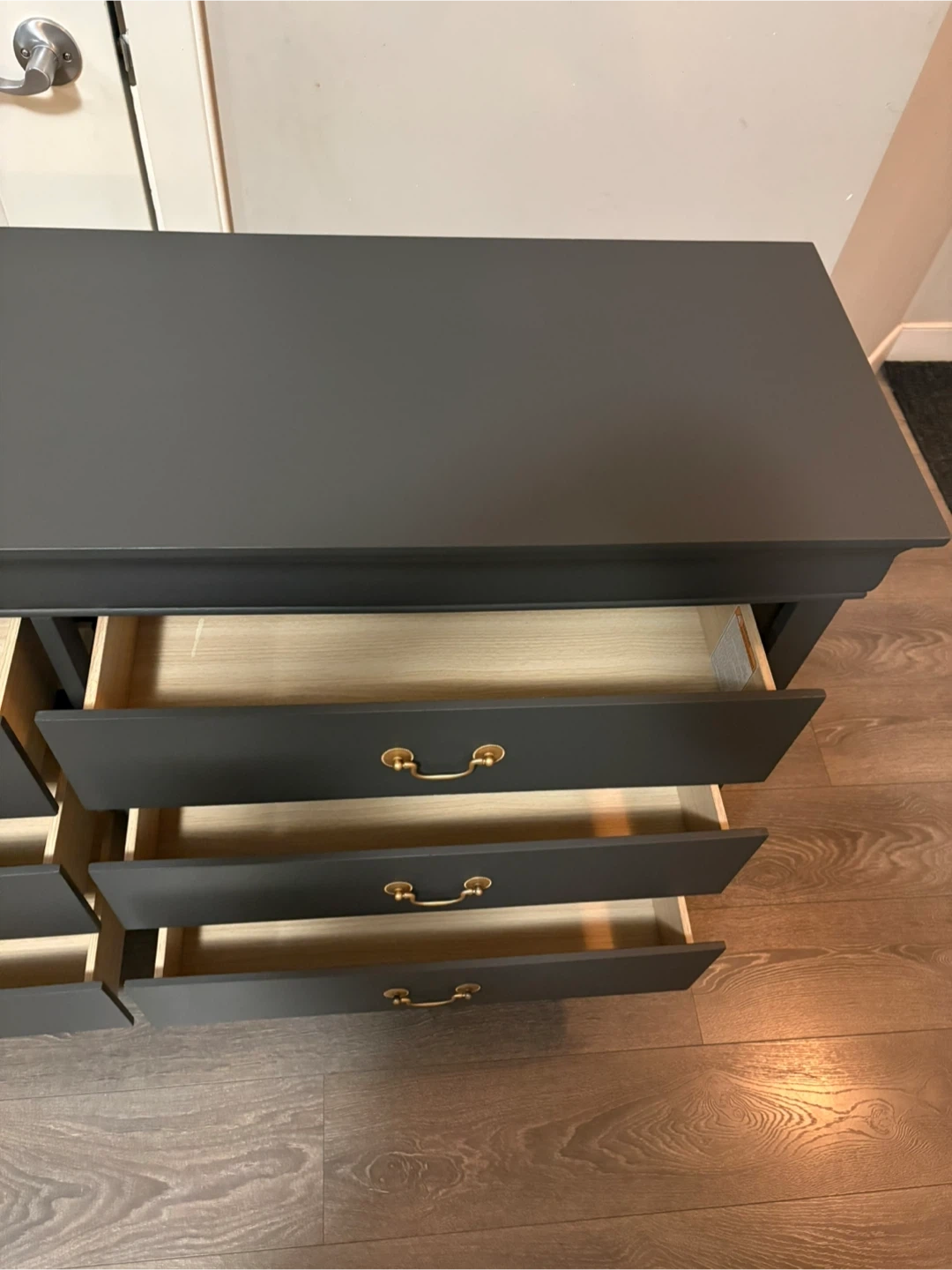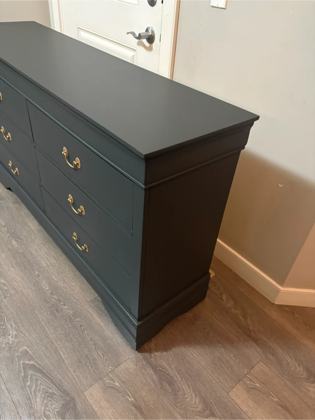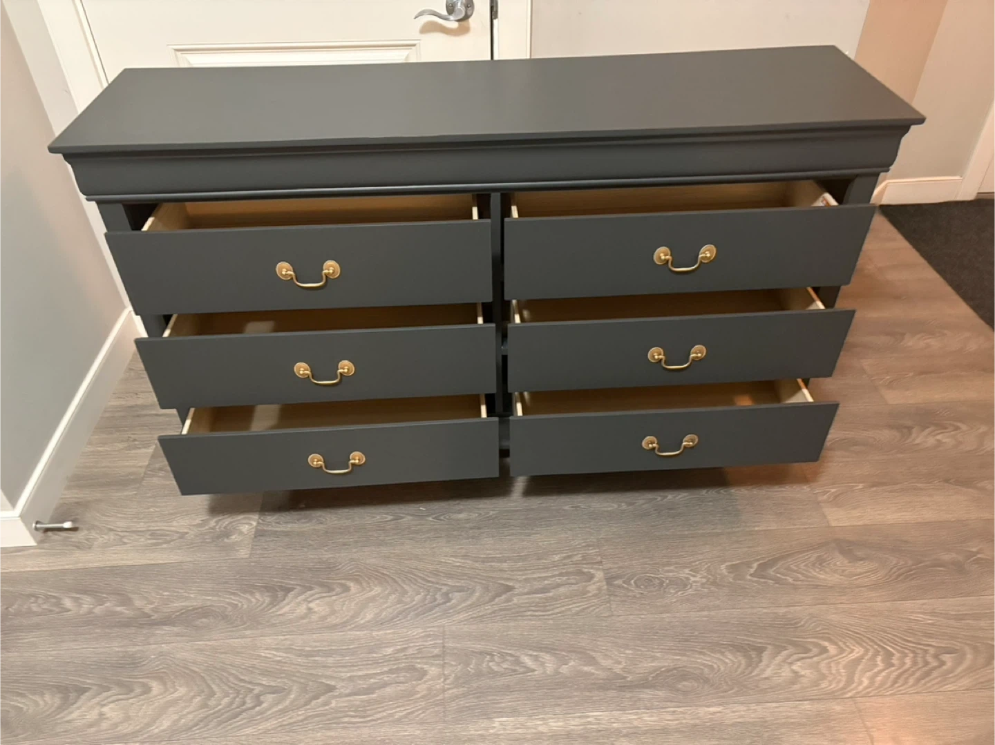 This stylish 6-drawer dresser is perfect for adding storage and a touch of elegance to any bedroom. The dresser has been refinished in a modern iron ore (dark grey) with gold hardware, making it a standout piece. Its spacious drawers offer ample room for clothes and accessories.