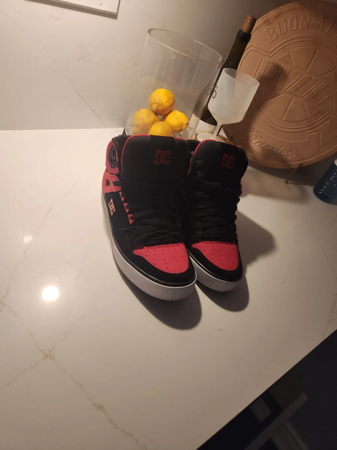 DC Shoes high-top sneakers in black and red. These stylish kicks are perfect for everyday wear or hitting the skate park. They offer great ankle support and a classic look.
