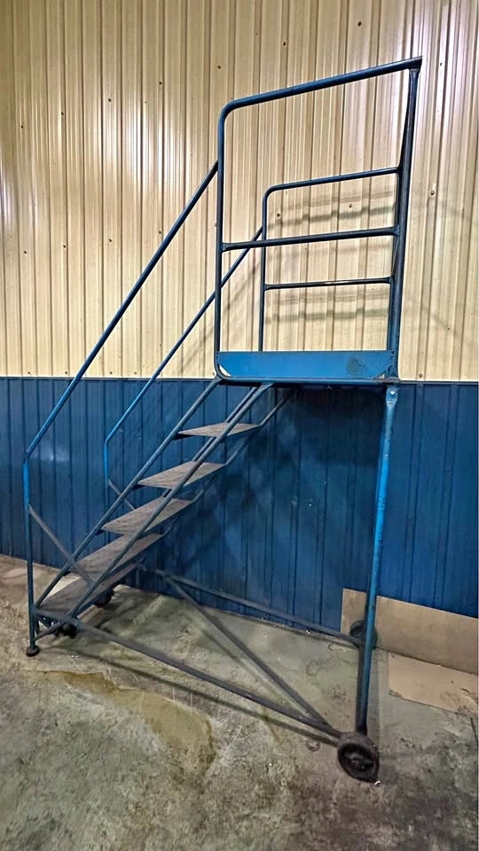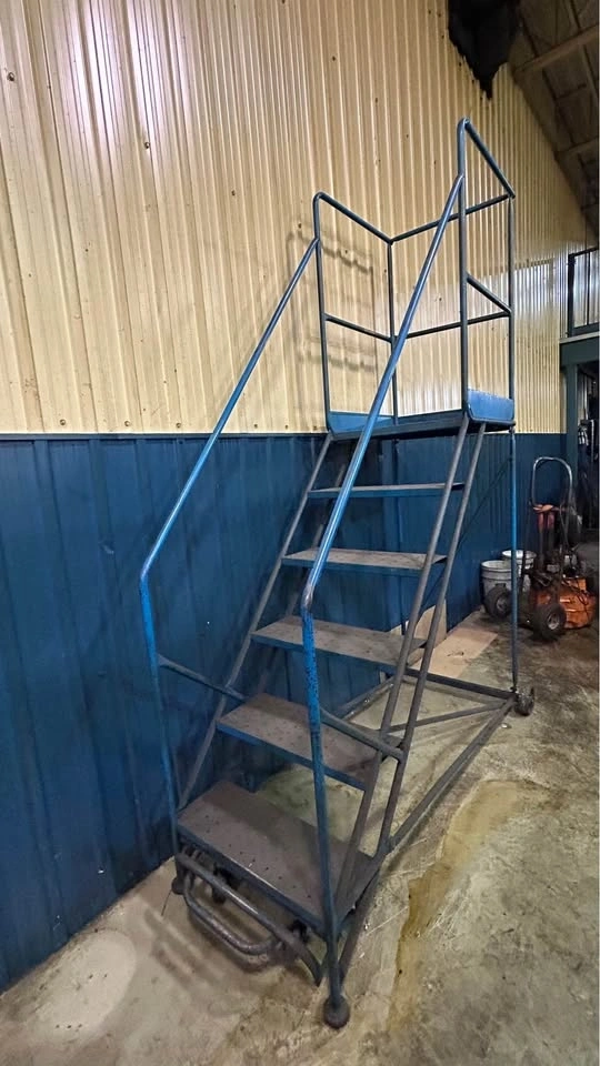 This rolling ladder is great for any warehouse or shop. It is in used condition, but is perfectly functional. This ladder features a sturdy frame with non-slip steps and handrails on both sides for added safety. The ladder is equipped with wheels, making it easy to move around your workspace. It's fantastic for getting to those top shelves! Sturdy steel construction, non-slip steps, handrails on both sides, wheels for easy mobility.