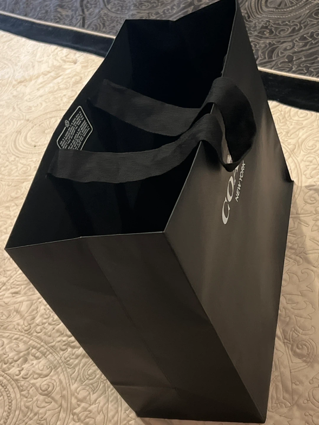 This is a Coach shopping bag. It's made from paper. It features the Coach New York logo. COACH Paper Shopping Bag Black 13 X 16 X 6.5