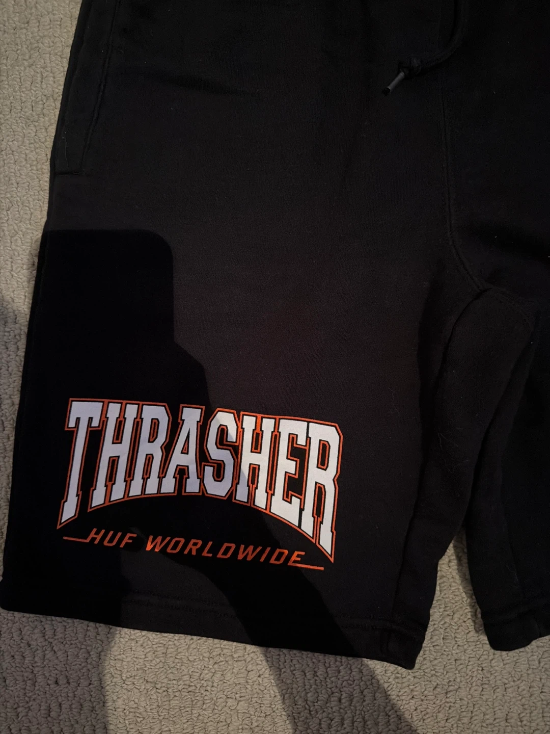 Black HUF x Thrasher sweatshorts with a large Thrasher logo graphic. Elastic waistband with a drawstring. Bought from Zumiez couple of years ago, barely worn.