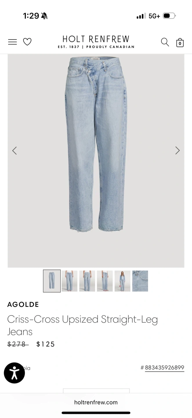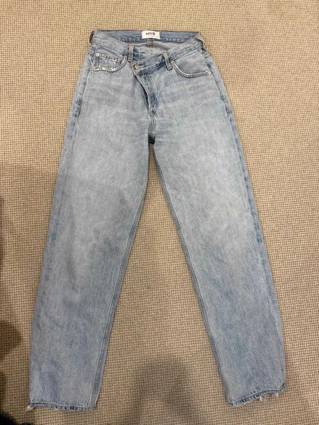 You're looking at a pair of AGOLDE Criss-Cross Upsized Straight-Leg Jeans! Originally price: $278, these jeans feature a unique criss-cross design and a comfortable straight-leg fit. They're perfect for adding a stylish twist to your wardrobe.