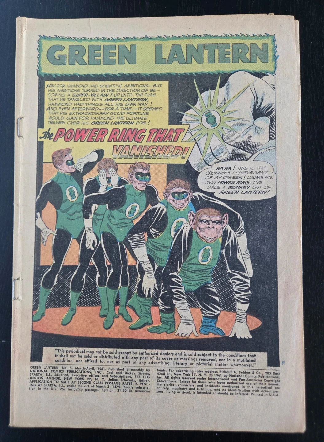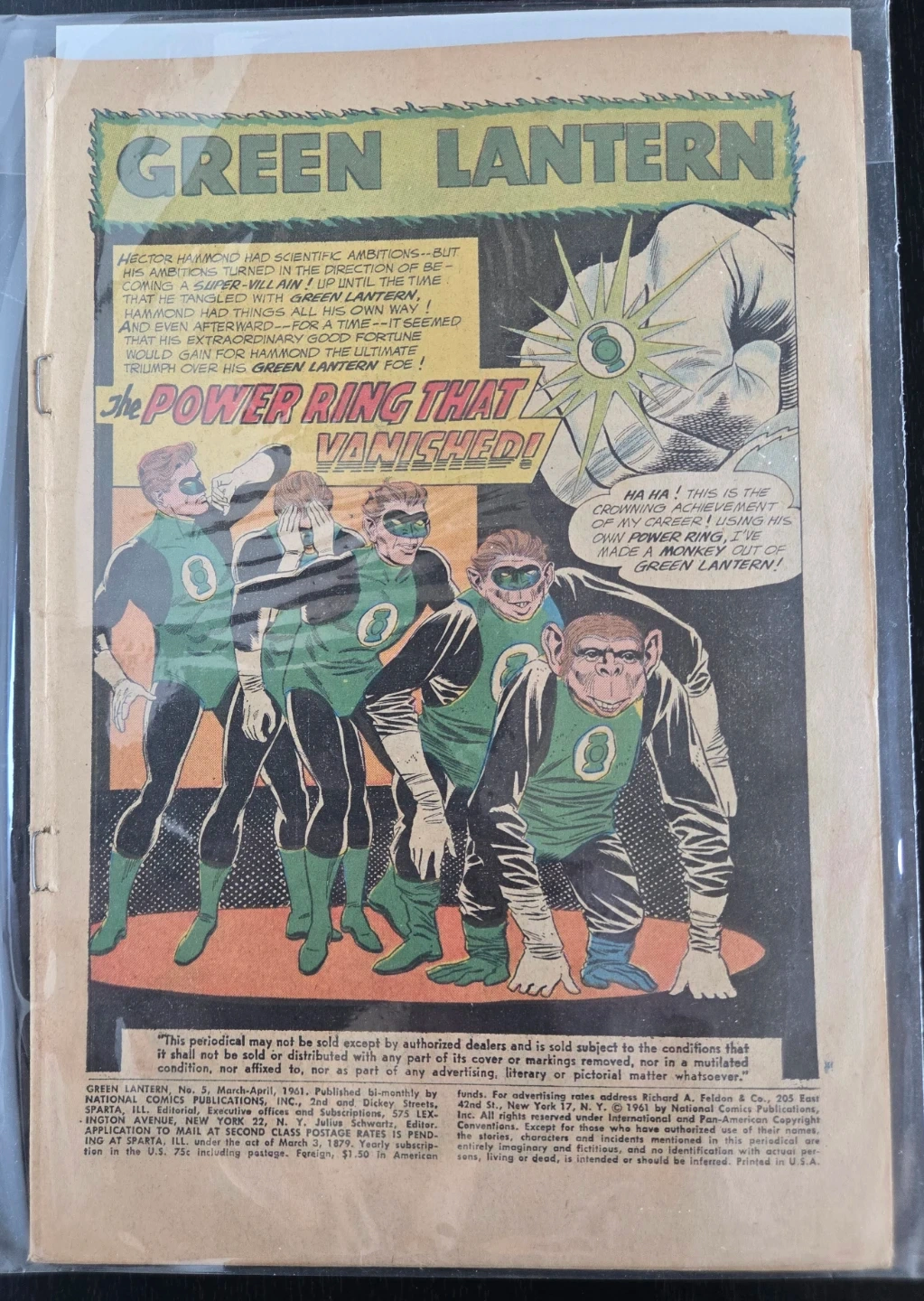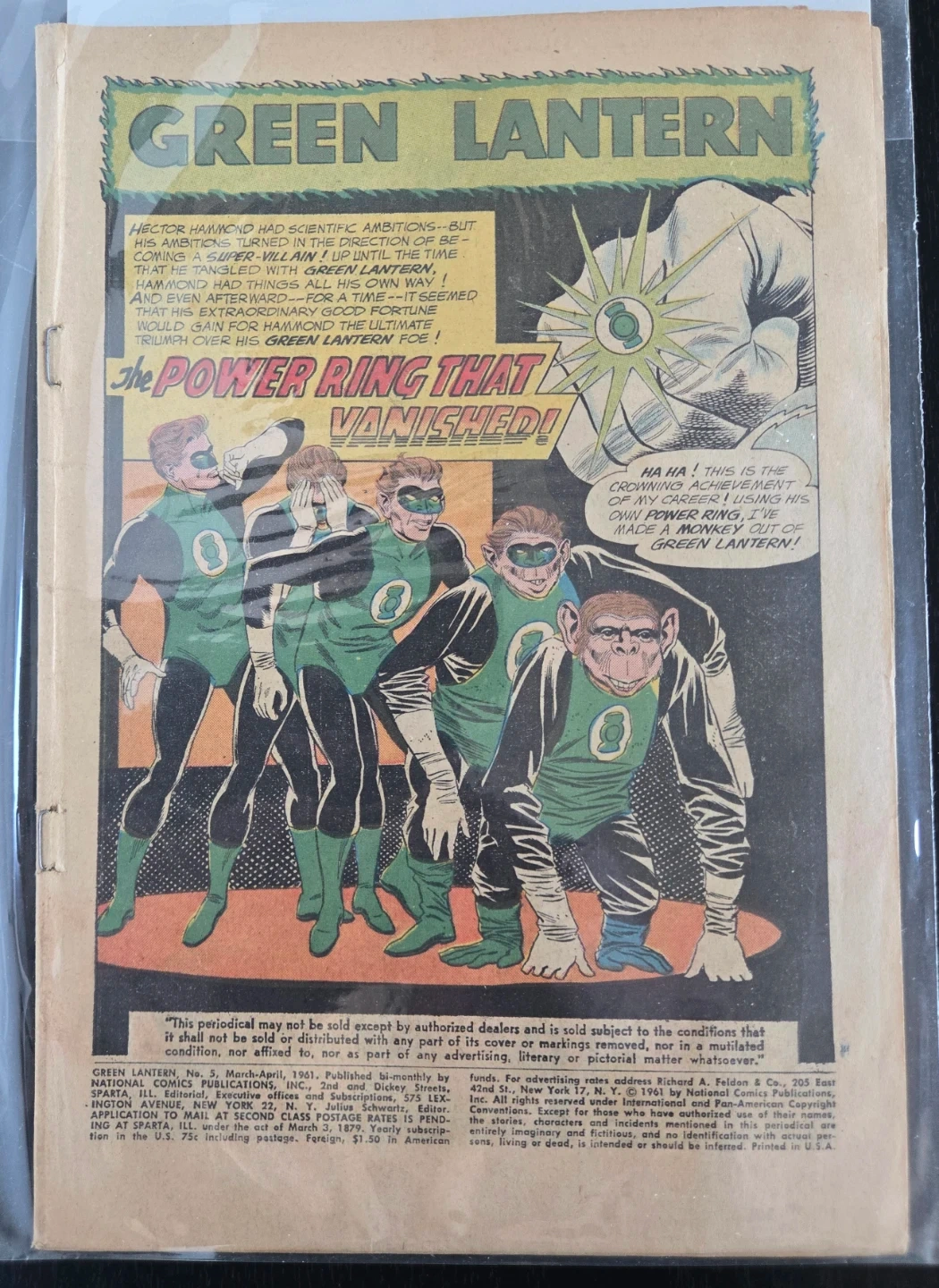 This is an Original Green Lantern comic issue No. 5, 1961. It is a Coverless Copy. It features the story "The Power Ring That Vanished!". Key Issue Featuring the First Appearance And Origin of Hector Hammond. While the Cover is Missing the interior is Complete And this comic Remains a Signifigant Piece of Silver Age History. Very Very Rare. Bagged and Boarded.This is a Great Opportunity for you to Own An Original Very Rare Key Issue Green Lantern Book at a Fraction of the Cost of the Complete Copy with Cover.