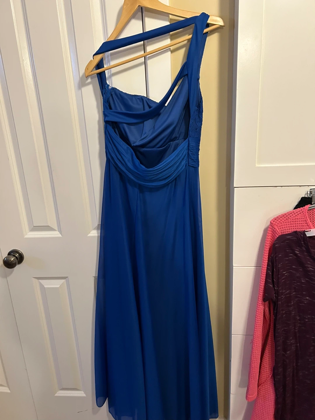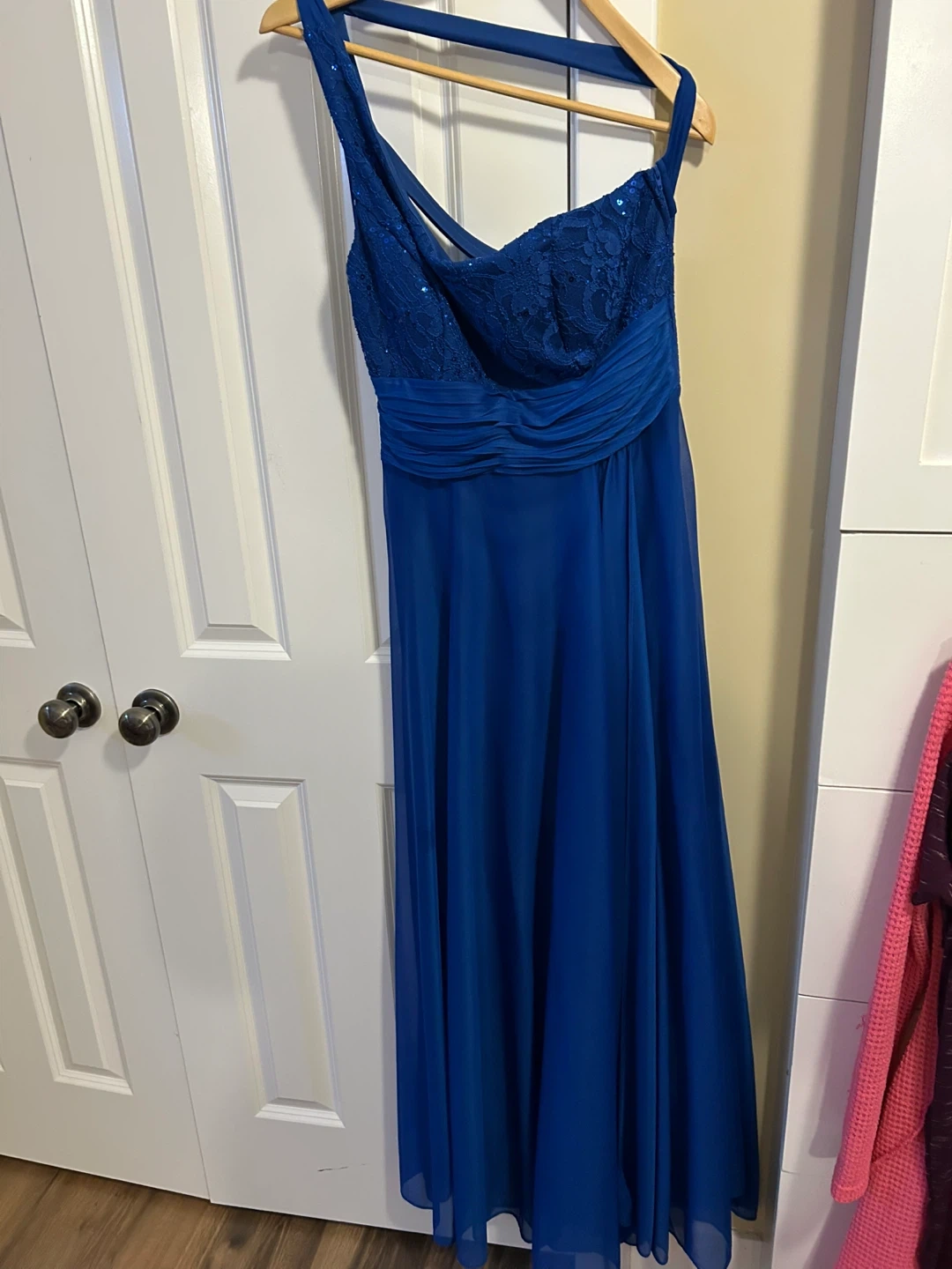 Beautiful royal blue bridesmaid dress with lace bodice and sequin accents. Features a flattering ruched waistband and flowing chiffon skirt. This dress is perfect for formal events and weddings!