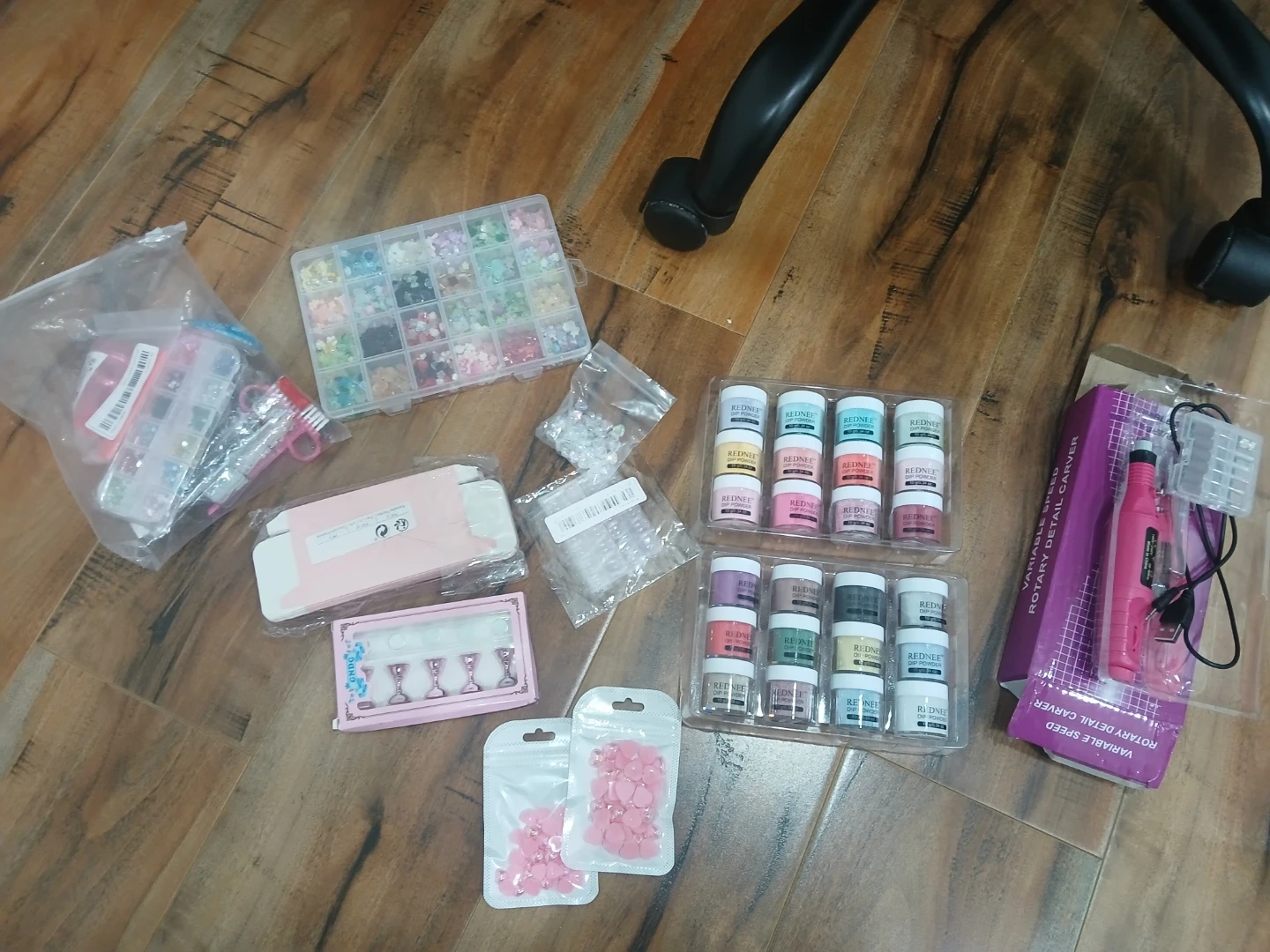 This bundle includes a set of RedNee dip powders and a pink variable speed rotary detail carver with accessories. It also contains various nail art decorations like glitter, charms, and rhinestones. Great for creating custom nail designs!