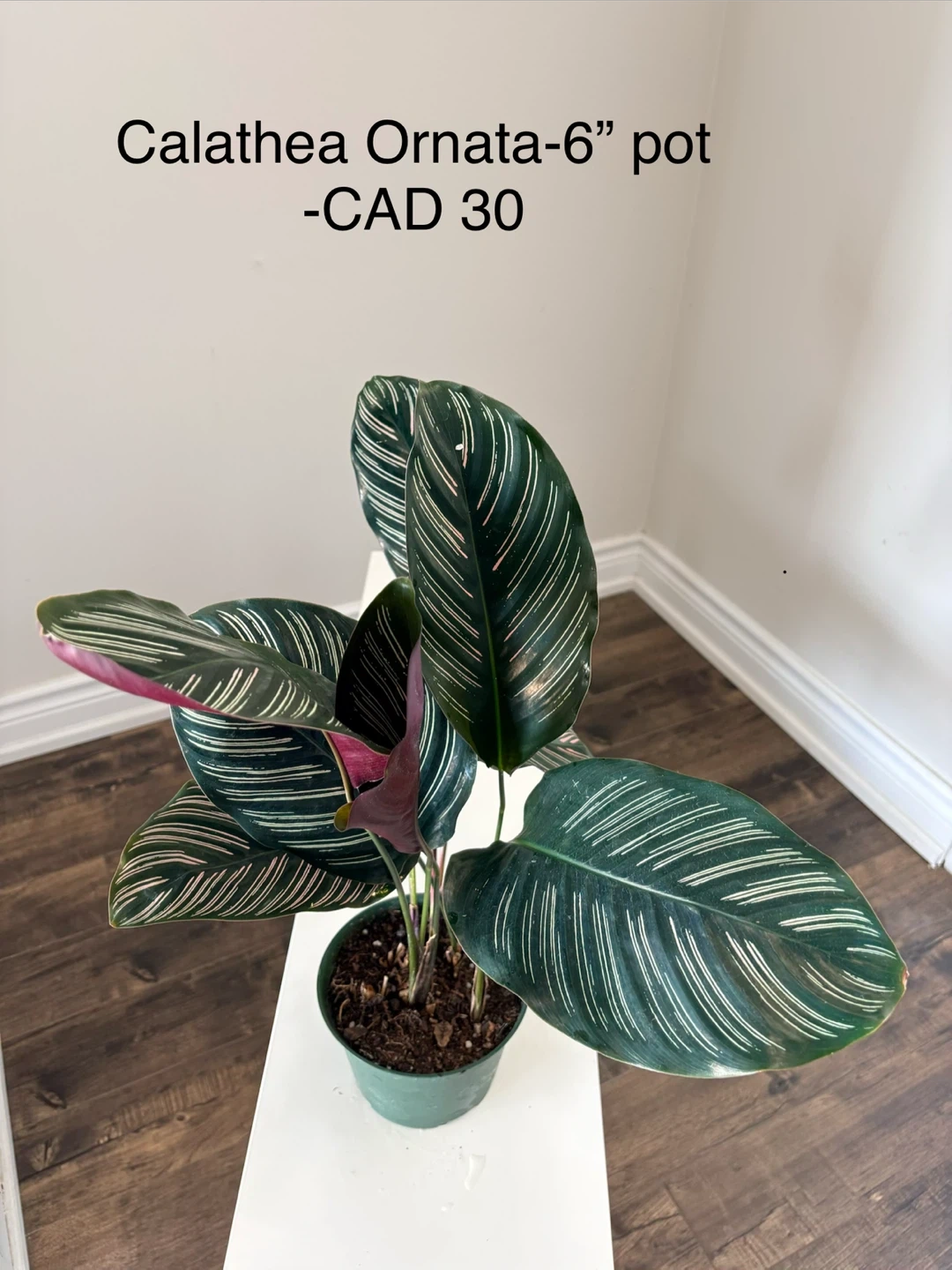 Beautiful Calathea Ornata plant in a 6-inch pot. Its dark green leaves have striking white pinstripes. This plant adds a lovely touch to any indoor space.