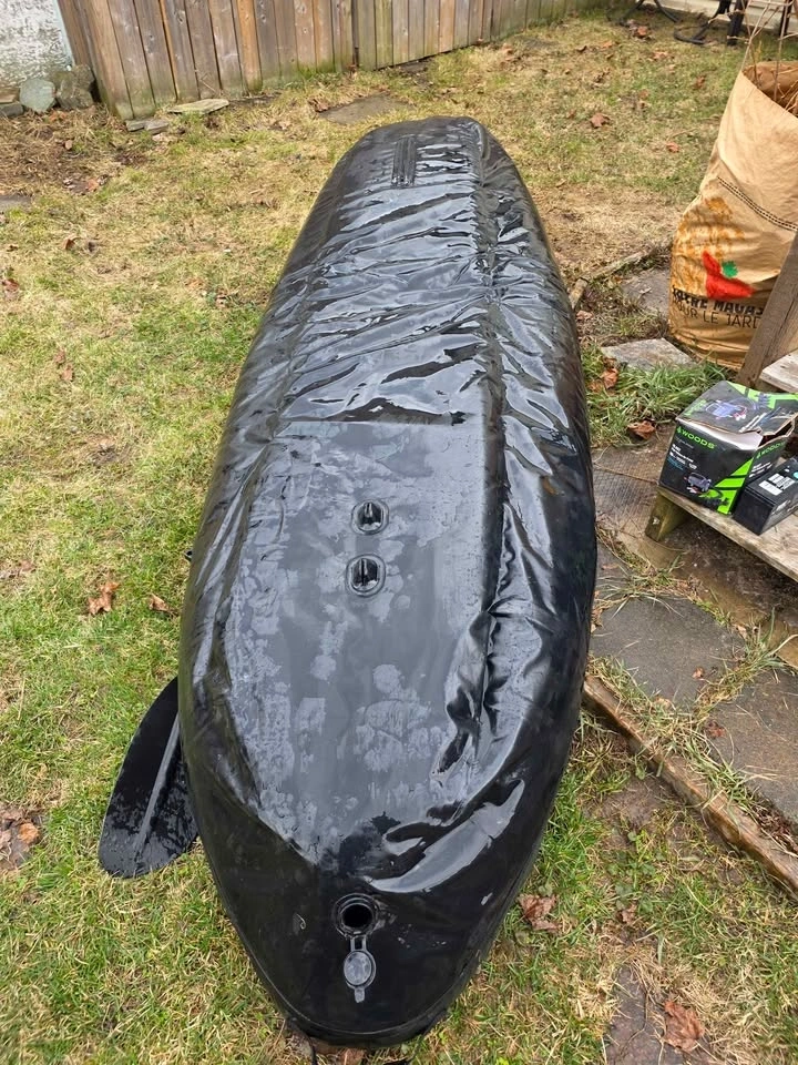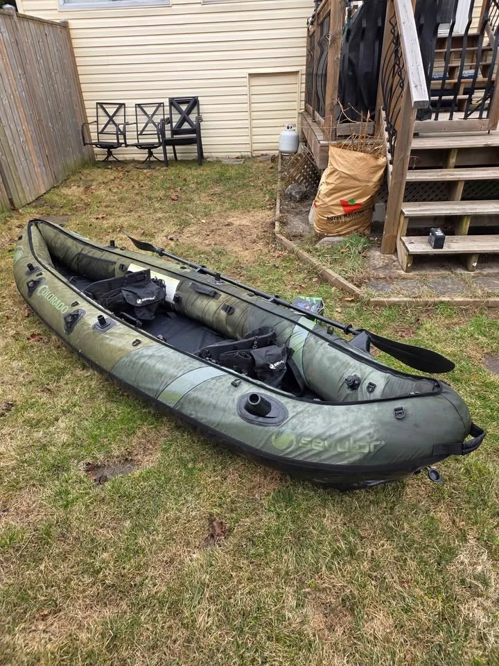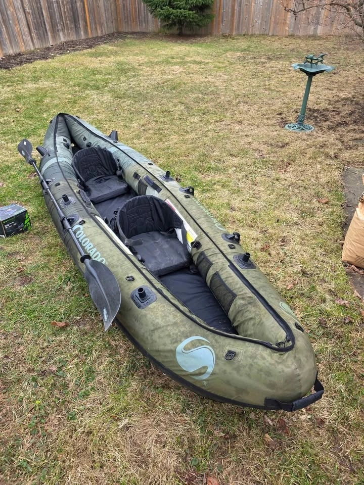 I've had this kayak for 2 years and only used it a handful of times. It works great for getting on the water without needing a truck and is good for fishing. No leaks or tears on the bottom, it's really thick and tough. Floor, sides, and seats all inflate, and there are storage nets on the backs of the seats. Comes with the proper pump to inflate it. You can buy a trolling motor mount for it as well. Goes for $800+ new on Amazon.