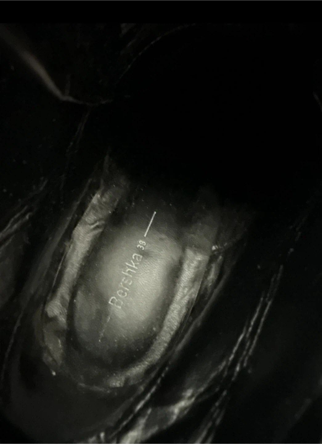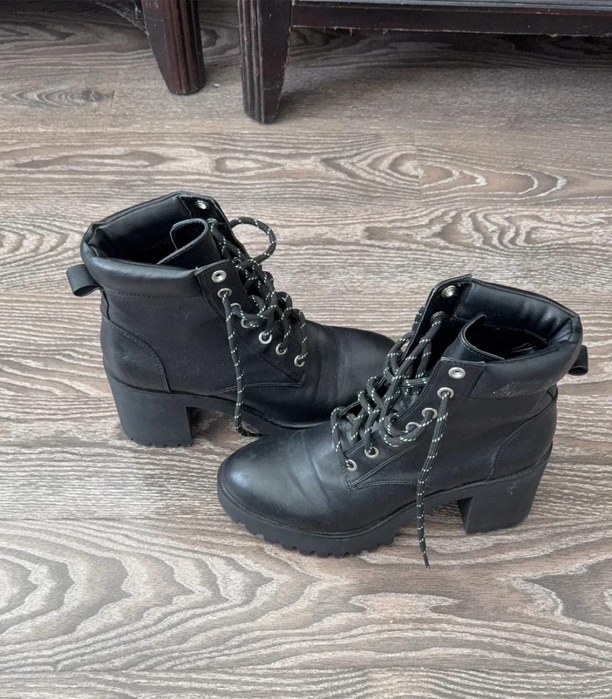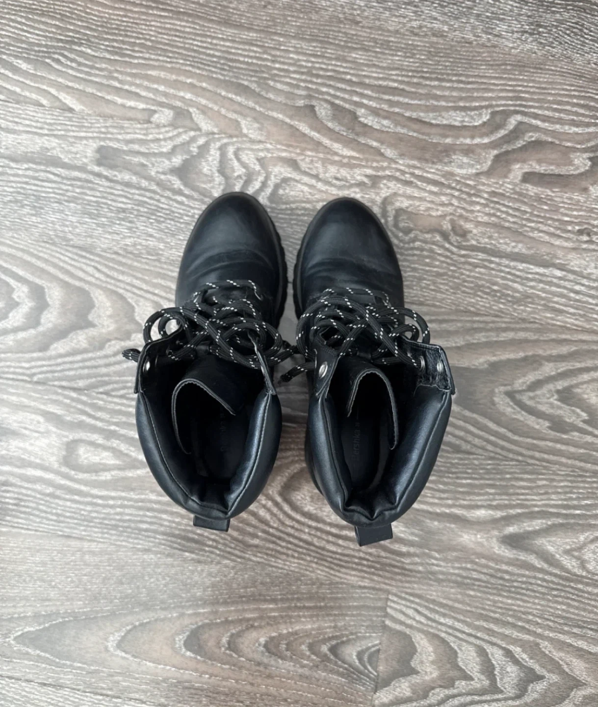 Black faux leather combat boots from Bershka. They feature a lace-up front and a chunky block heel. Size 38/7