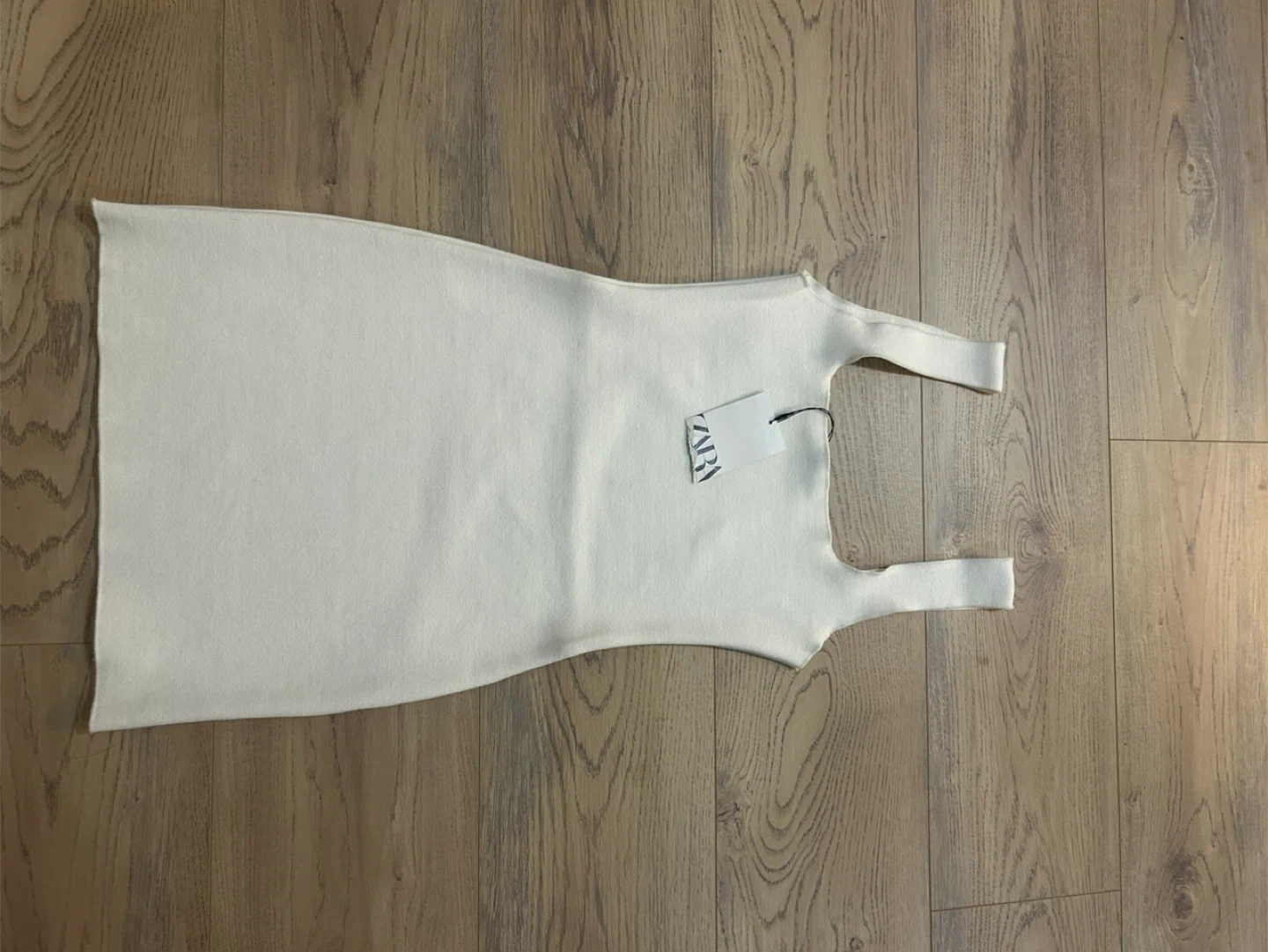 A classic white knit tank top from ZARA. It's a versatile piece that can be dressed up or down. The material is a comfortable knit blend.