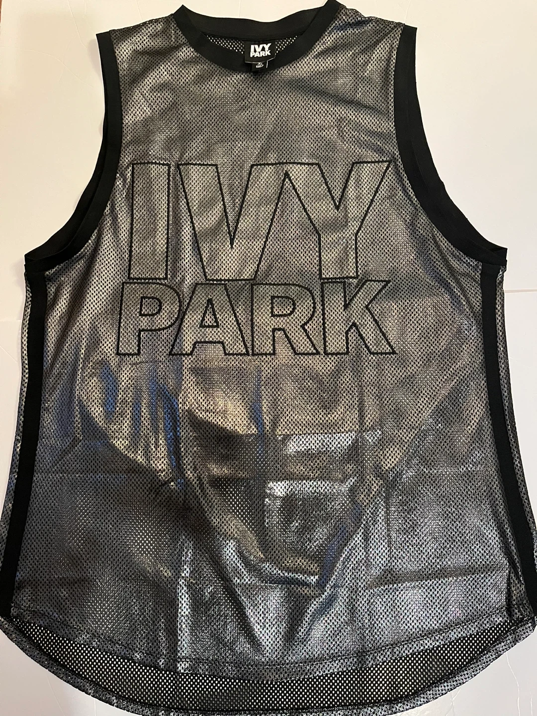 This is an IVY PARK metallic mesh tank top. It's a sleeveless design with black trim and "IVY PARK" boldly printed on the front. The material is a shiny, perforated mesh.