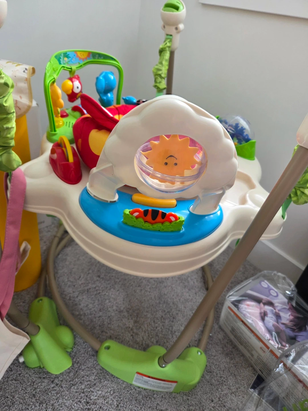 This baby activity jumper has a rotating seat with music and toys. It includes a soft cushion and a sturdy frame for bouncing. It's great for keeping little ones entertained and developing their motor skills.