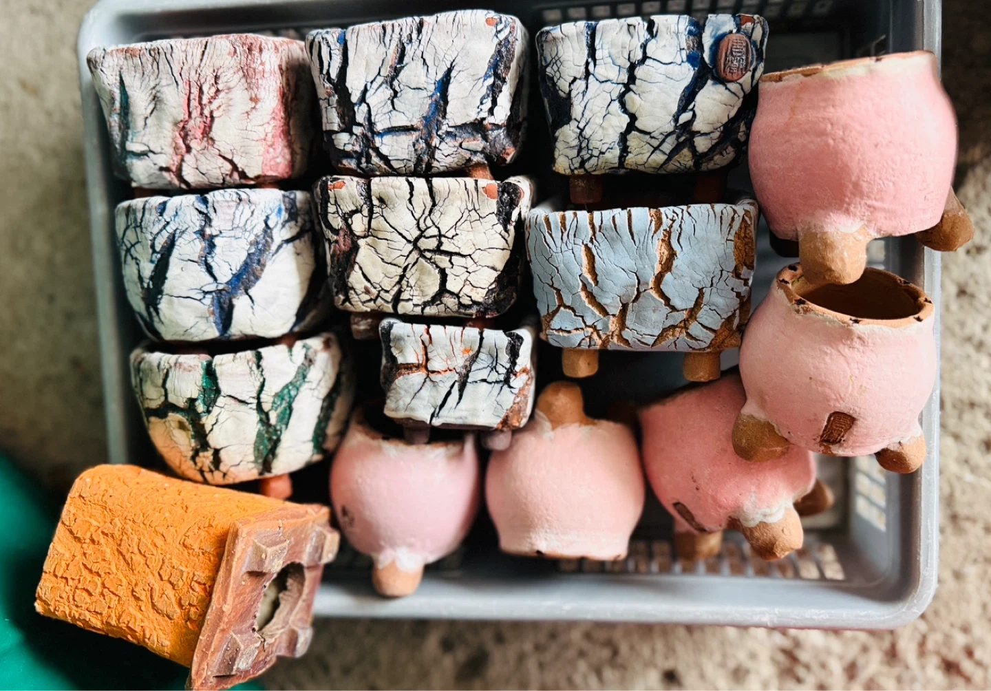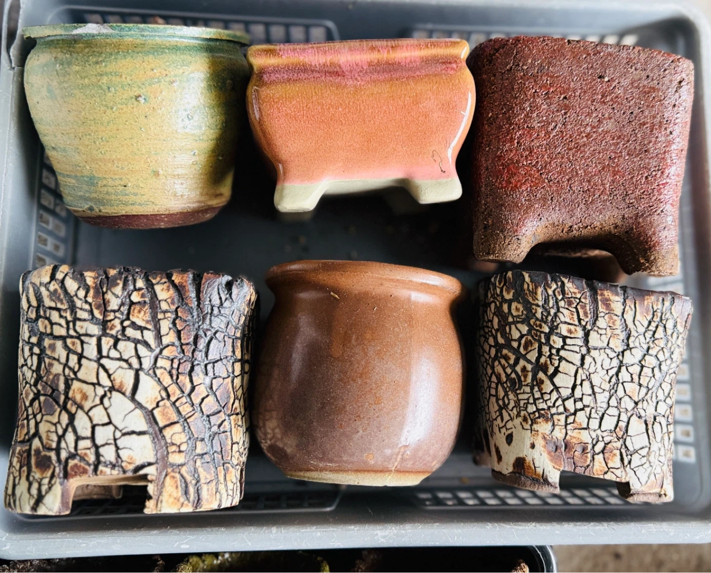 A collection of assorted ceramic plant pots in various colours and crackled finishes. These pots are perfect for small plants and succulents. They're made from durable ceramic material.