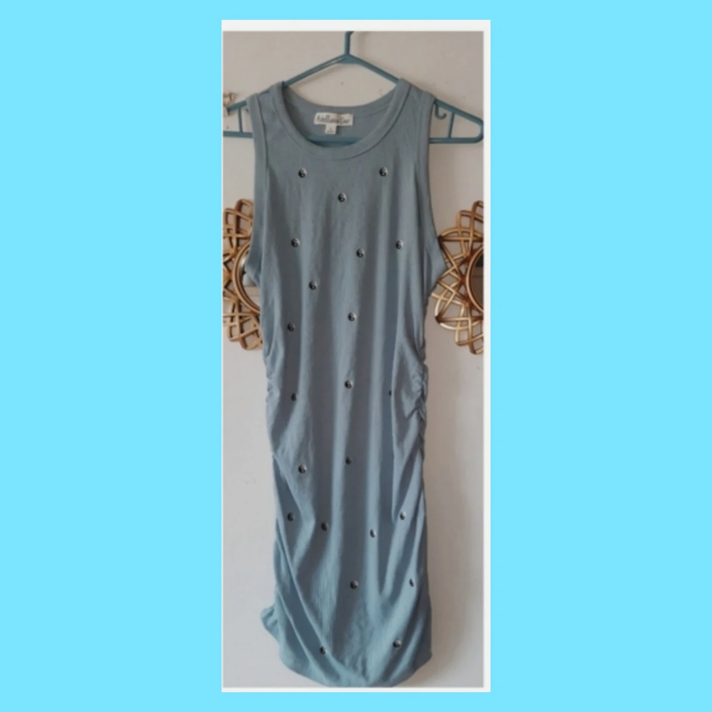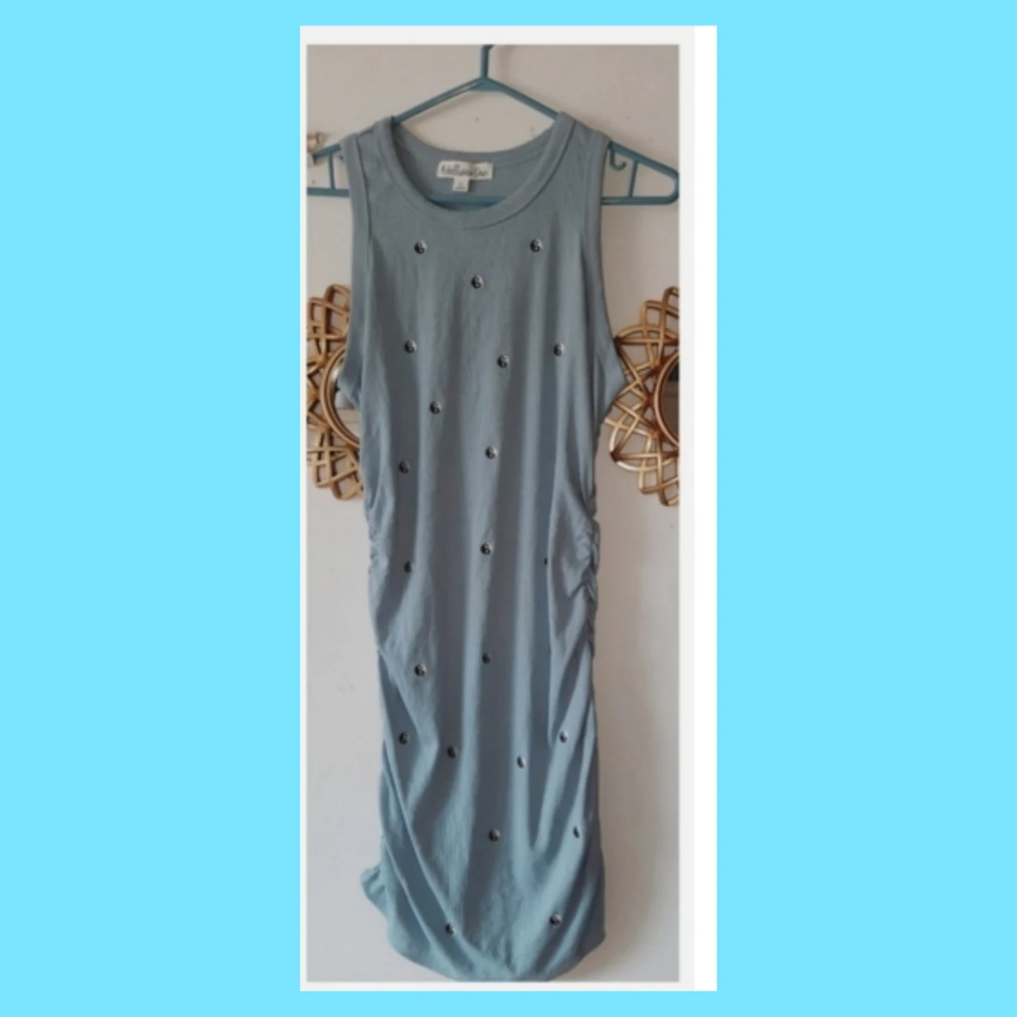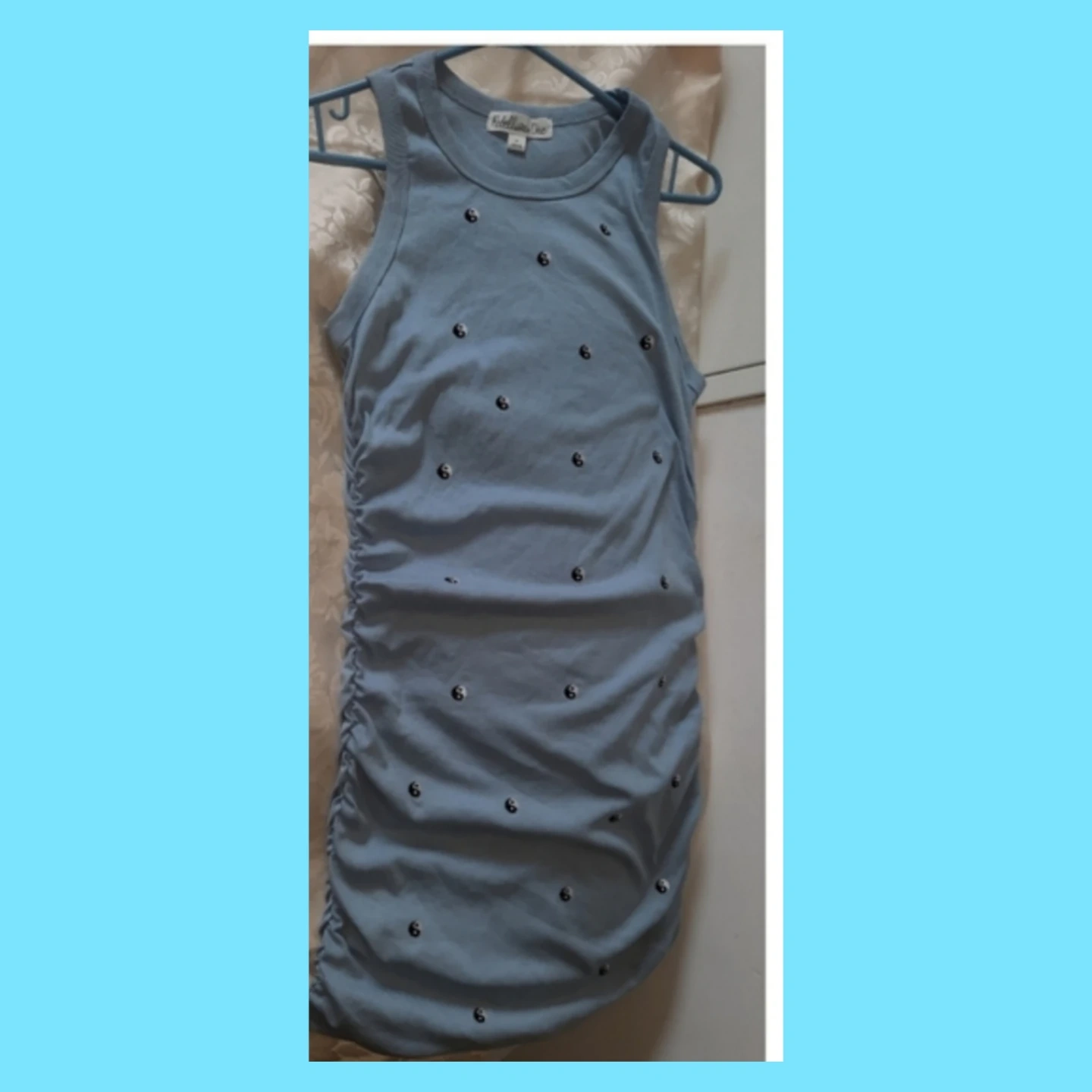 Light blue ribbed tank dress with silver embellishments. It features ruching on the side for a flattering fit. Crew neck and sleeveless design.